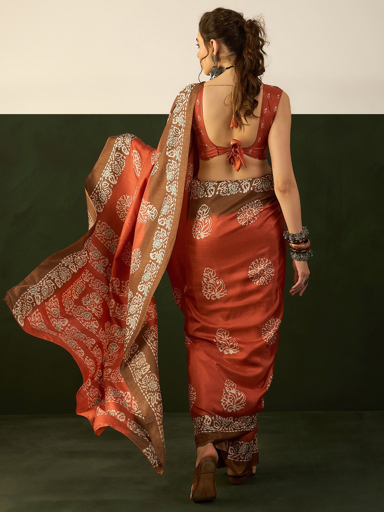 Women's Dola Silk Rust Printed Designer Saree With Blouse Piece