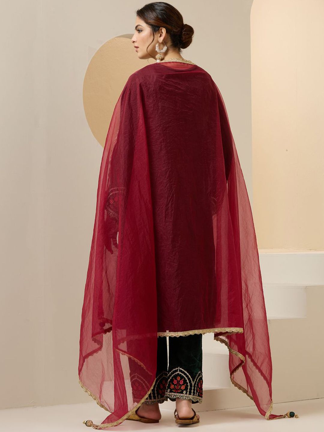 Dhiyona IS Women's Women Floral Embroidered Regular Thread Work Velvet Kurta with Trousers & With Dupatta