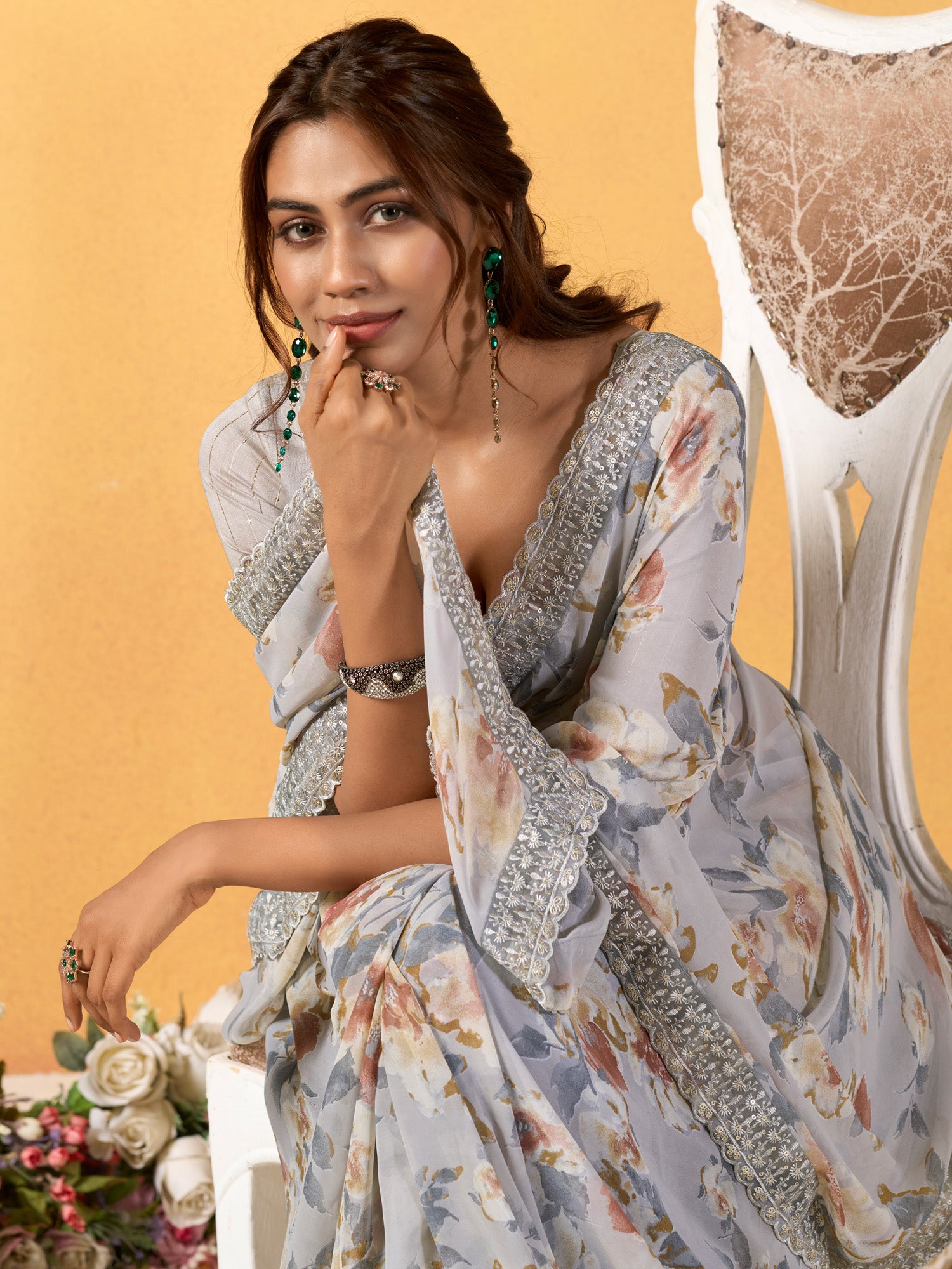 Women's Georgette Grey Embellished Designer Saree With Blouse Piece