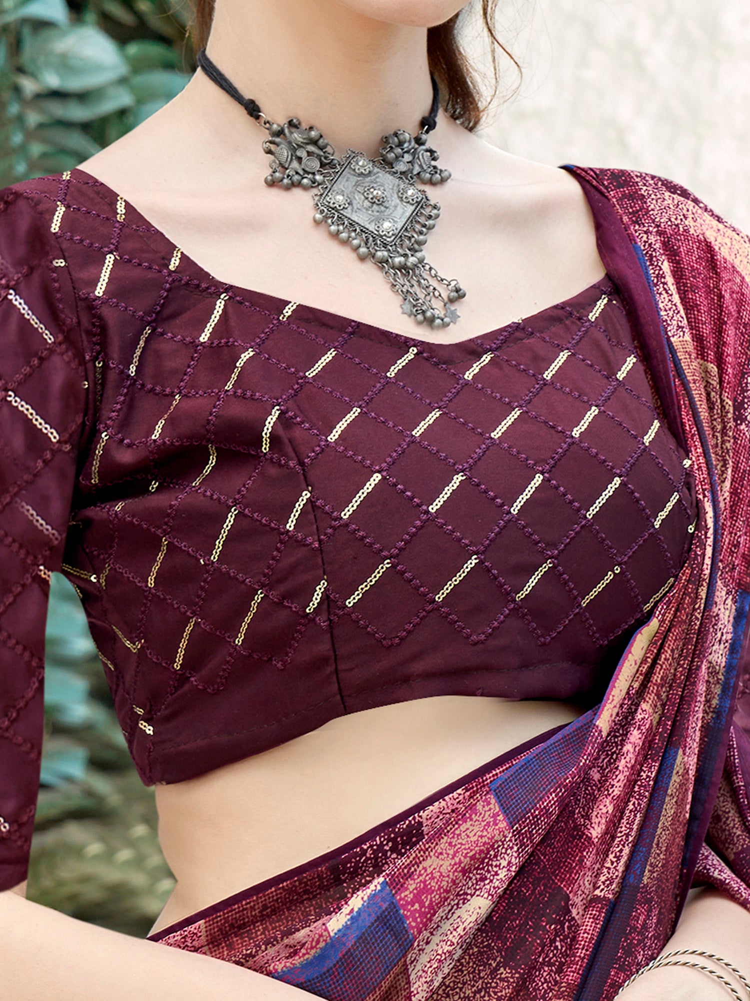 Women's Georgette Magenta Printed Designer Saree With Blouse Piece