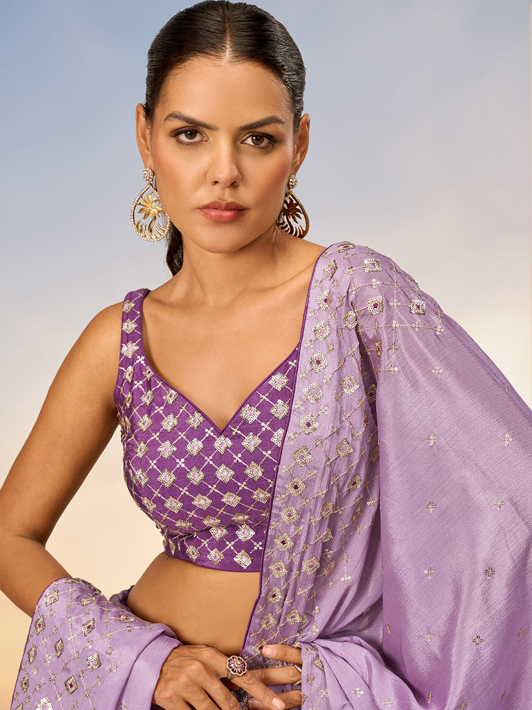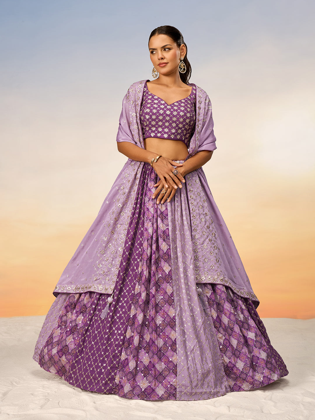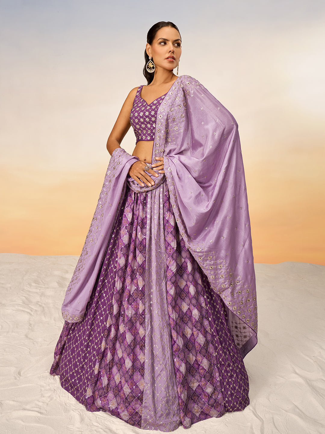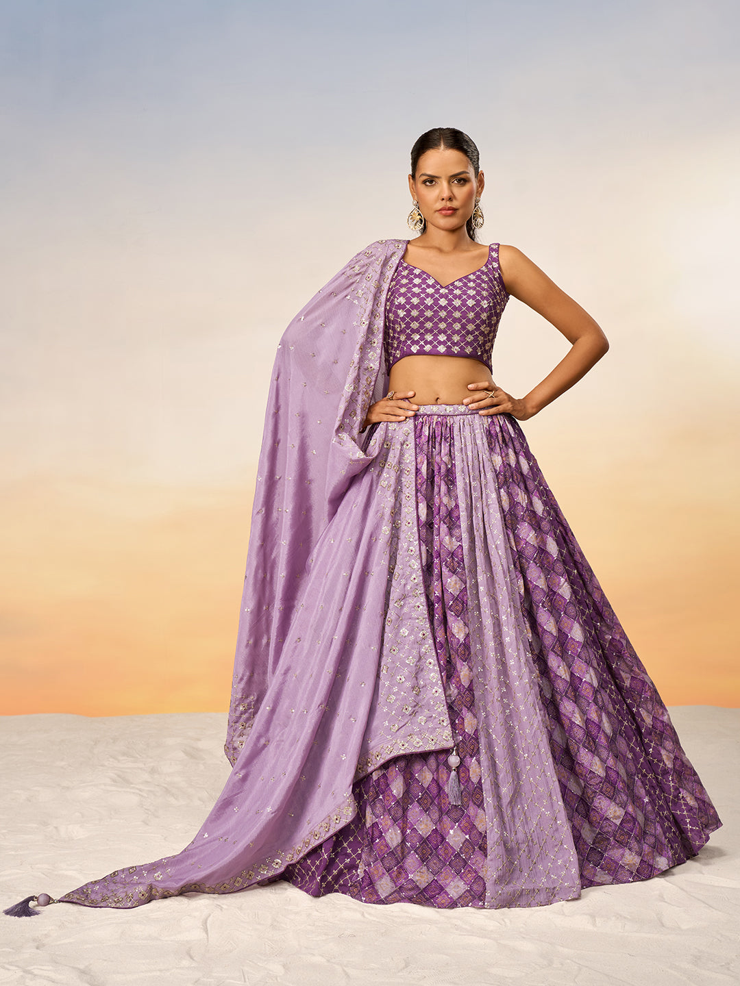 Women Lavender Pure Chiffon position print with Sequins embroidery Semi-Stitched Lehenga choli & Dupatta
