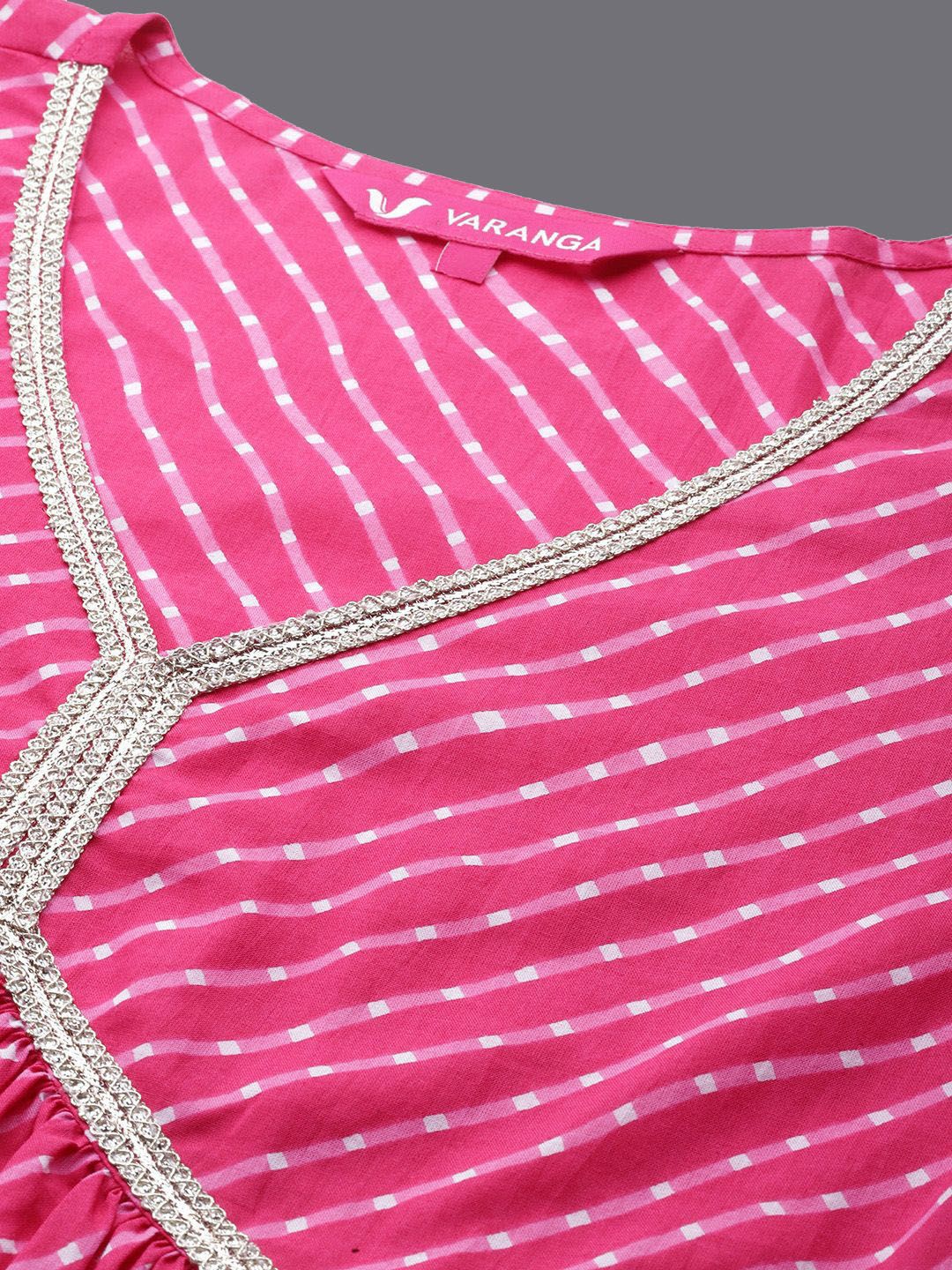 Dhiyona VA Women's Leheriya Printed Pleated Gotta Patti Pure Cotton Kurta with Trousers & With Dupatta