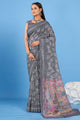 Women's Linen Blend Grey Printed Designer Saree With Blouse Piece