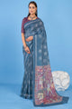 Women's Linen Blend Teal blue Printed Designer Saree With Blouse Piece