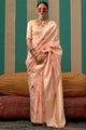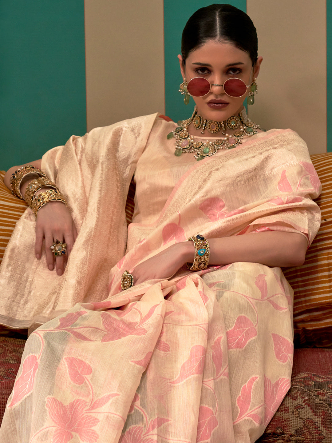 Women's Linen Cream Woven Design Designer Saree With Blouse Piece