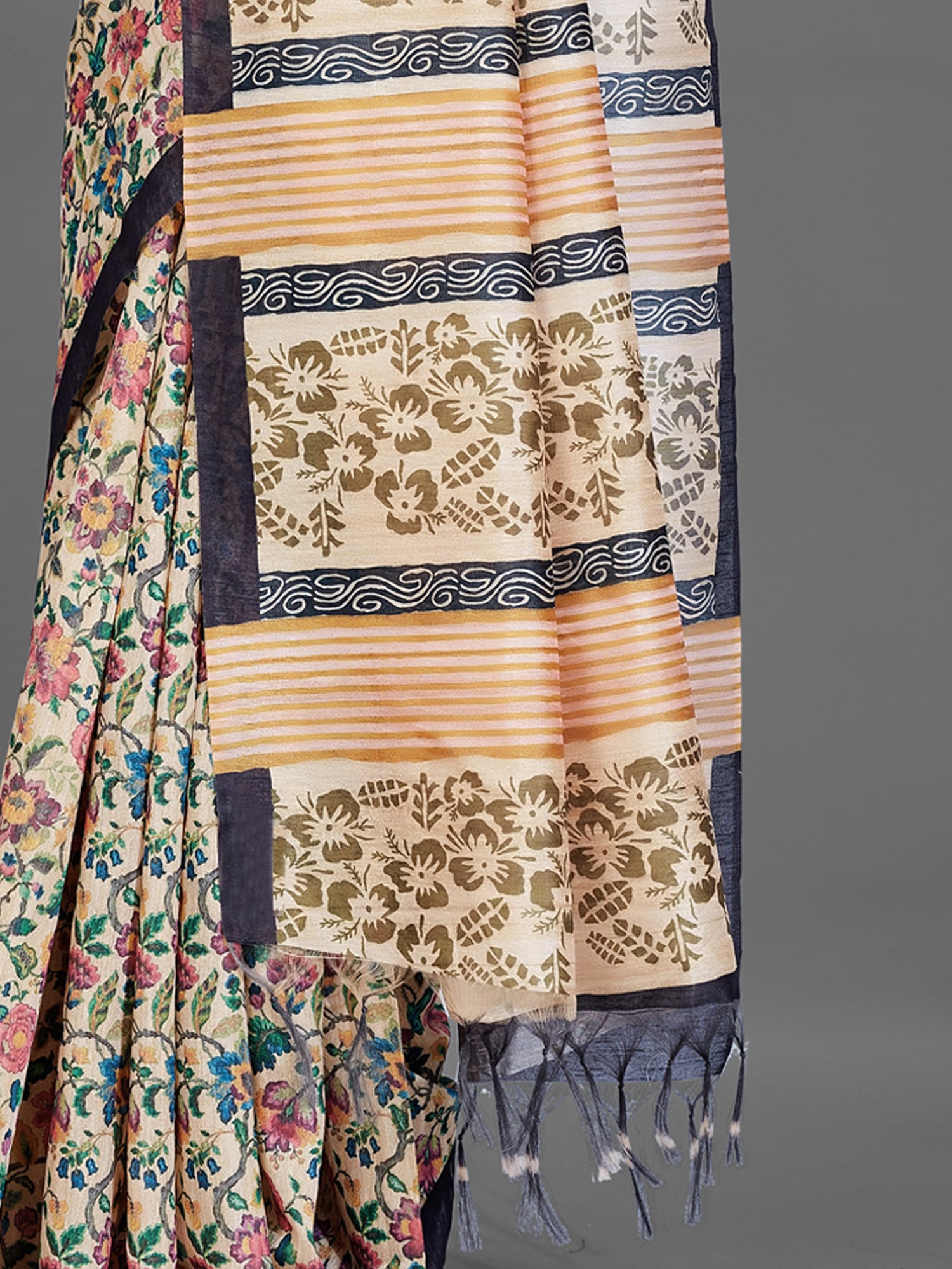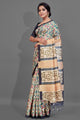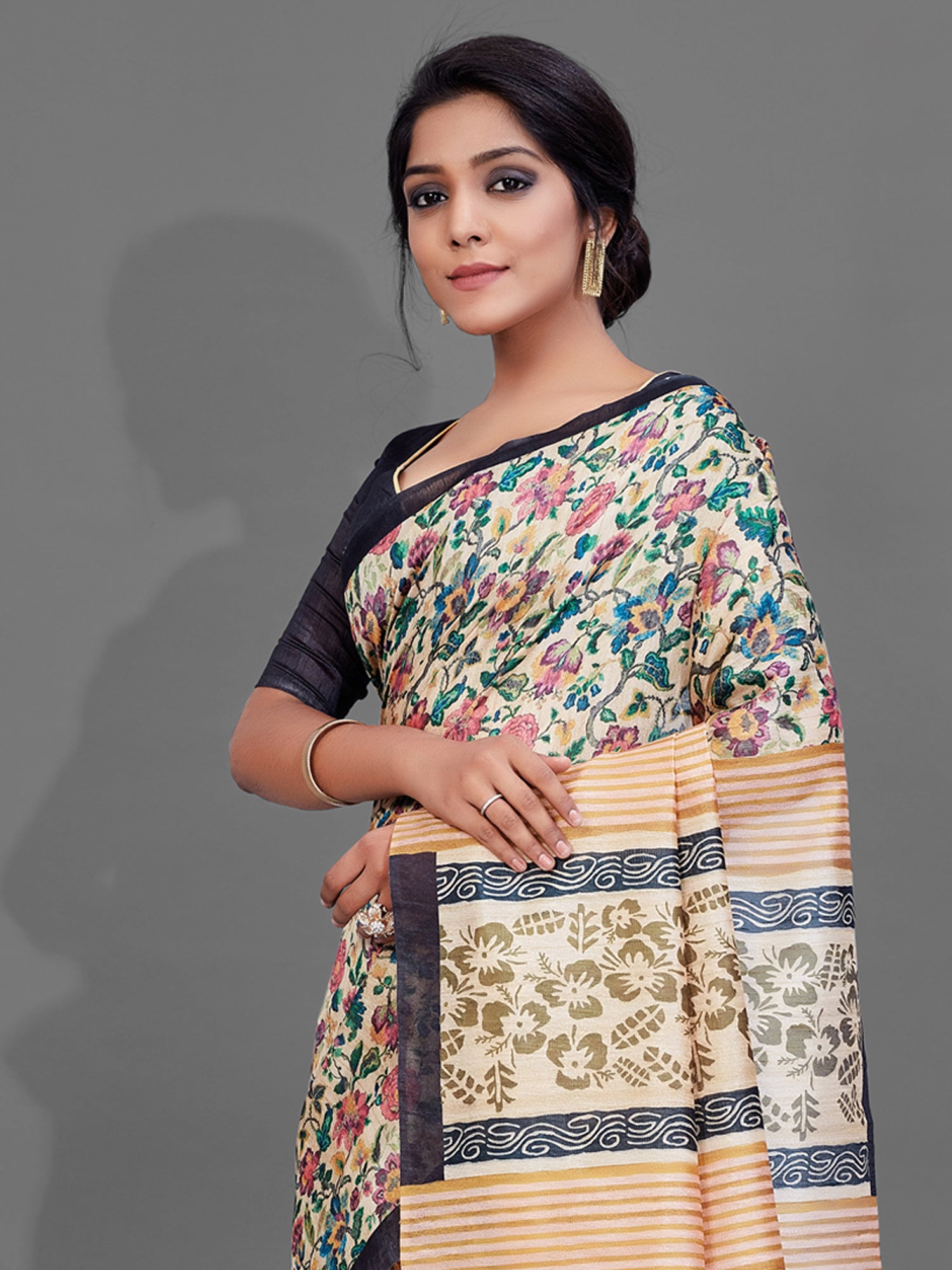 Women's Manipuri Silk Cream Digital Print Designer Saree With Blouse Piece