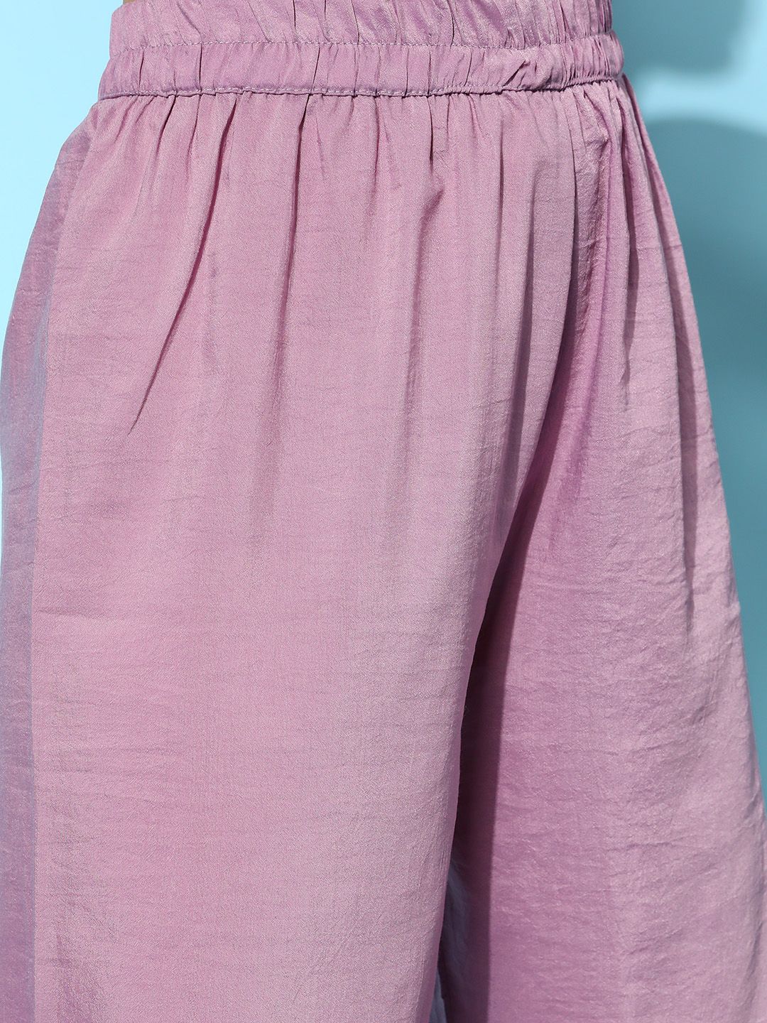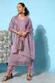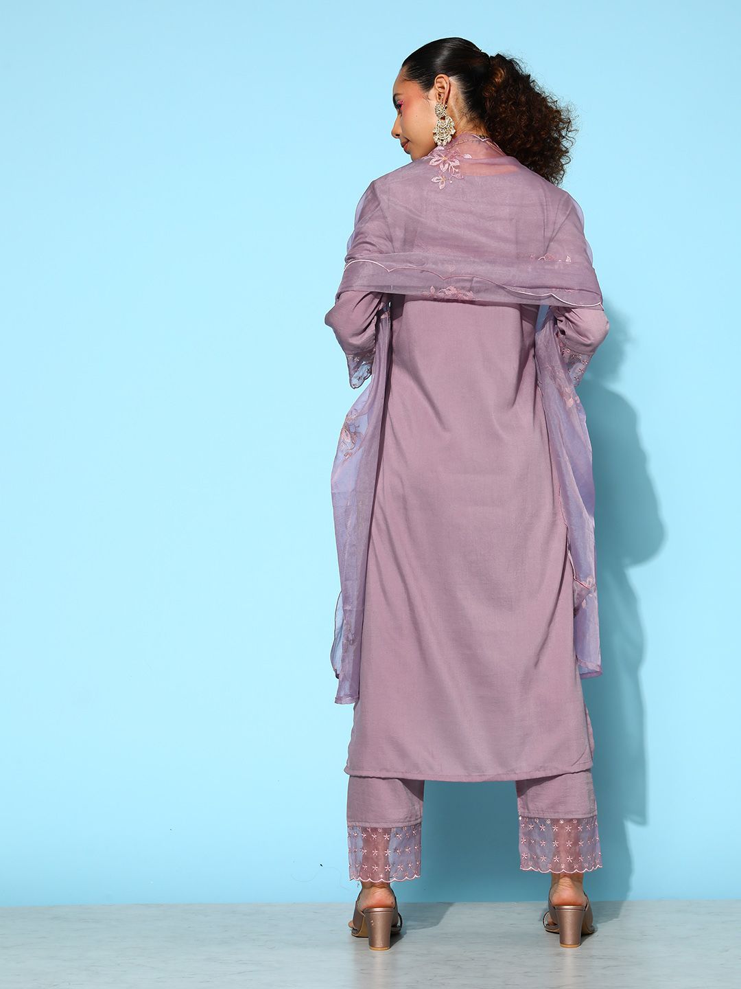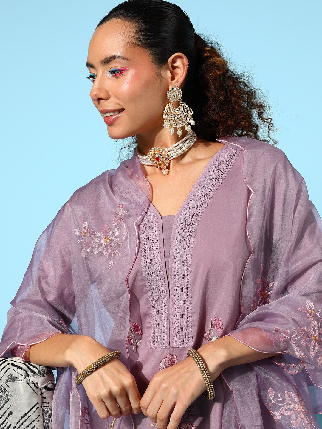 Dhiyona VA Women's Mauve Floral Embroidered Thread Work Kurta With Trousers & Dupatta
