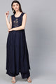 Navy Blue A-line calf length kurta with layered detail, has a round neck, three-quarter sleeves, flared hem