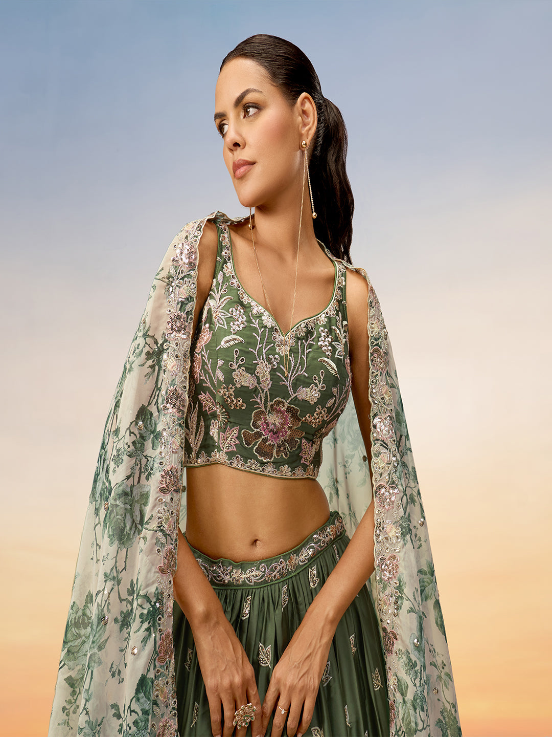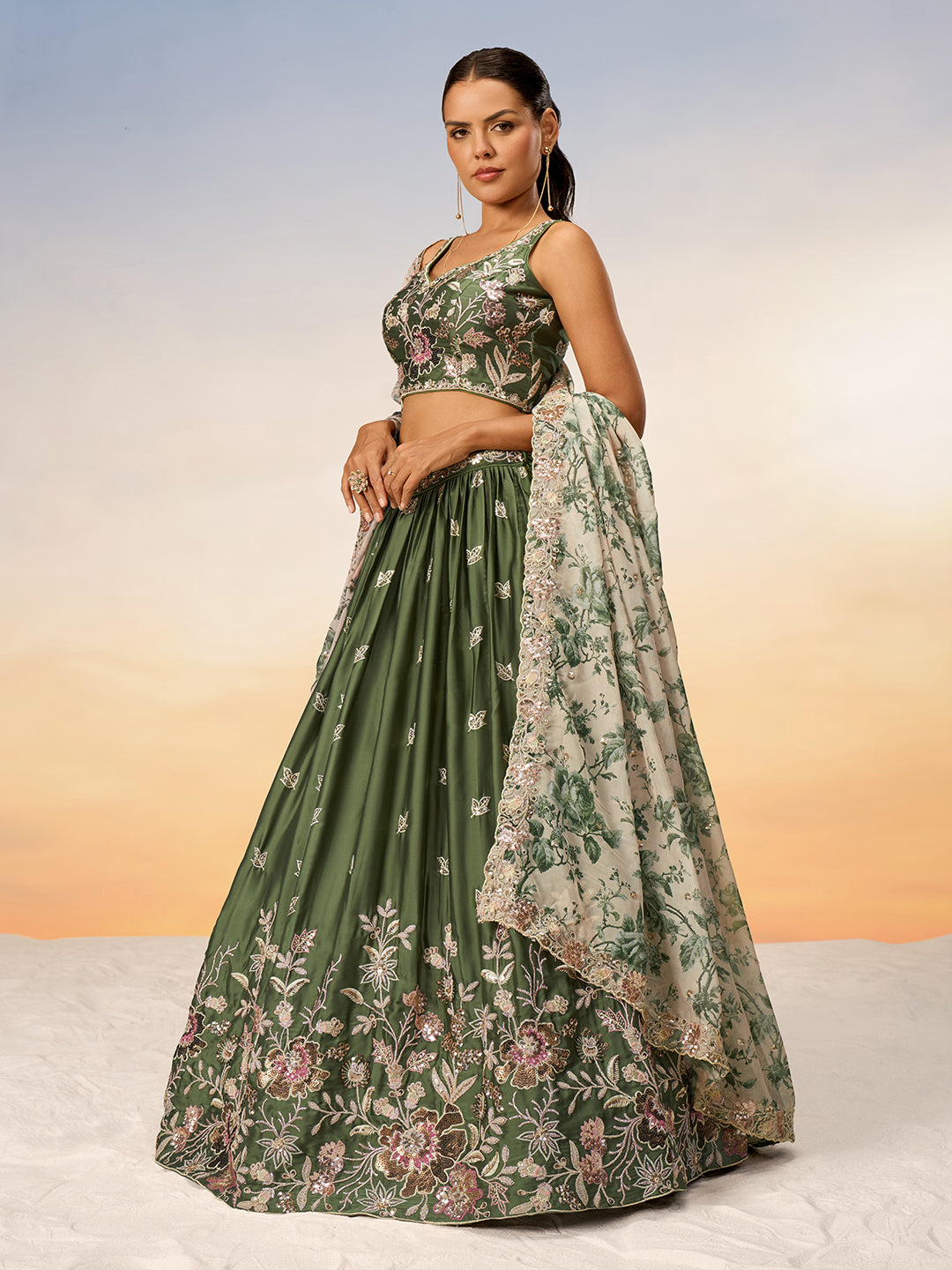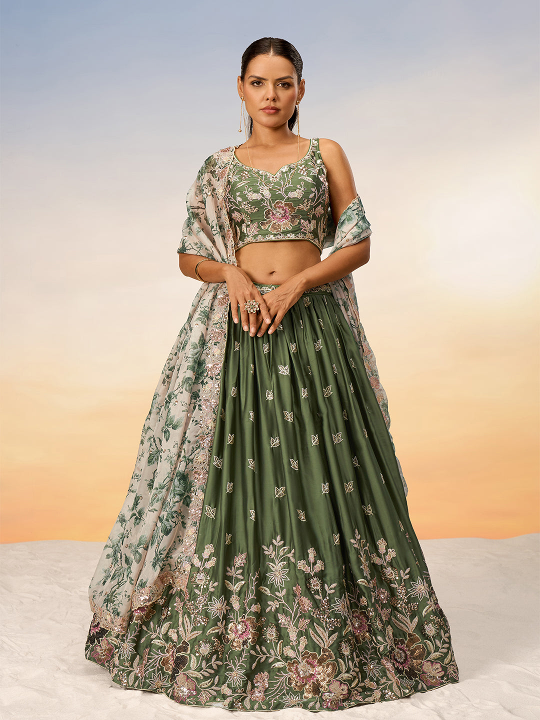Olive Satin silk Sequins embroidery Semi-Stitched Lehenga choli & Dupatta