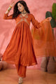 Women's Orange Floral Embroidered V-Neck A-Line Kurta With Trousers And Dupatta