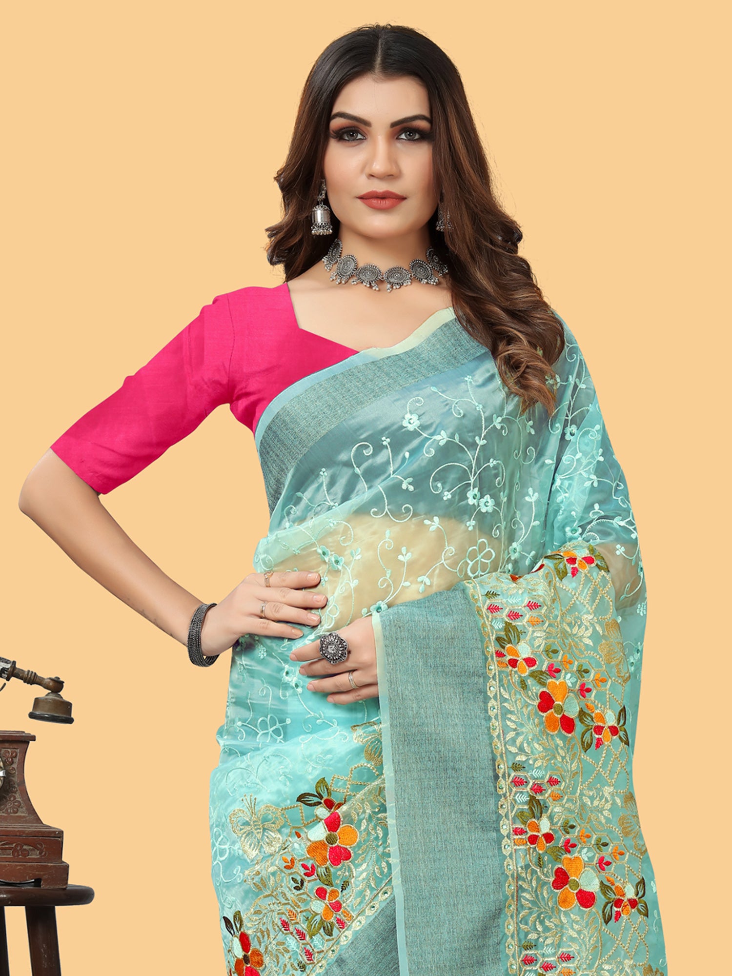 Women's Organza Blue Embroidered Designer Saree With Blouse Piece
