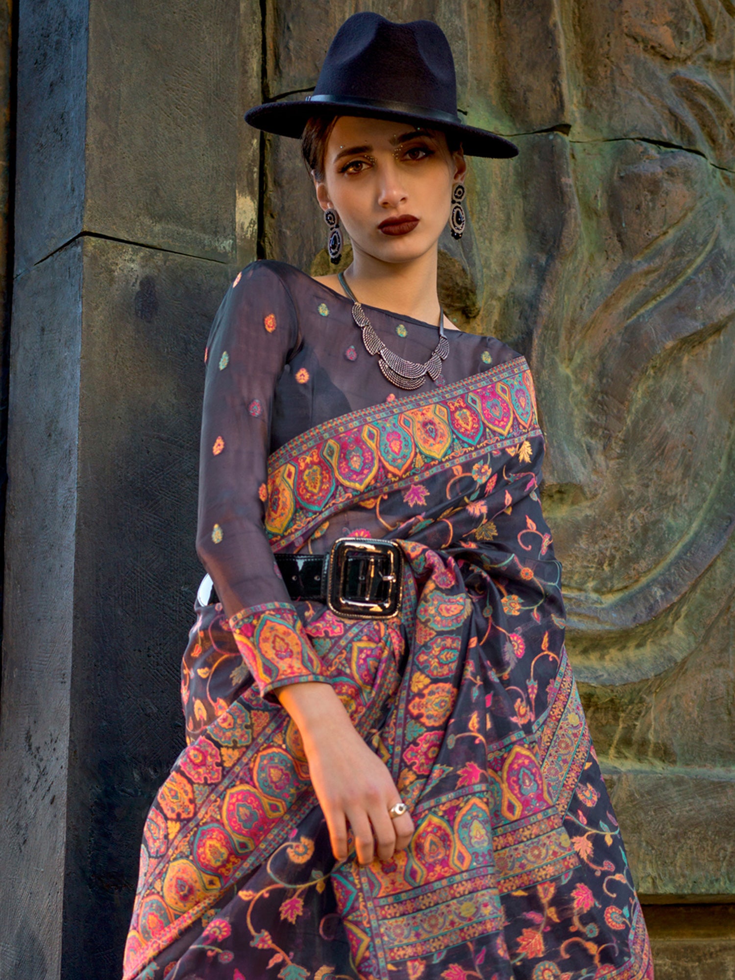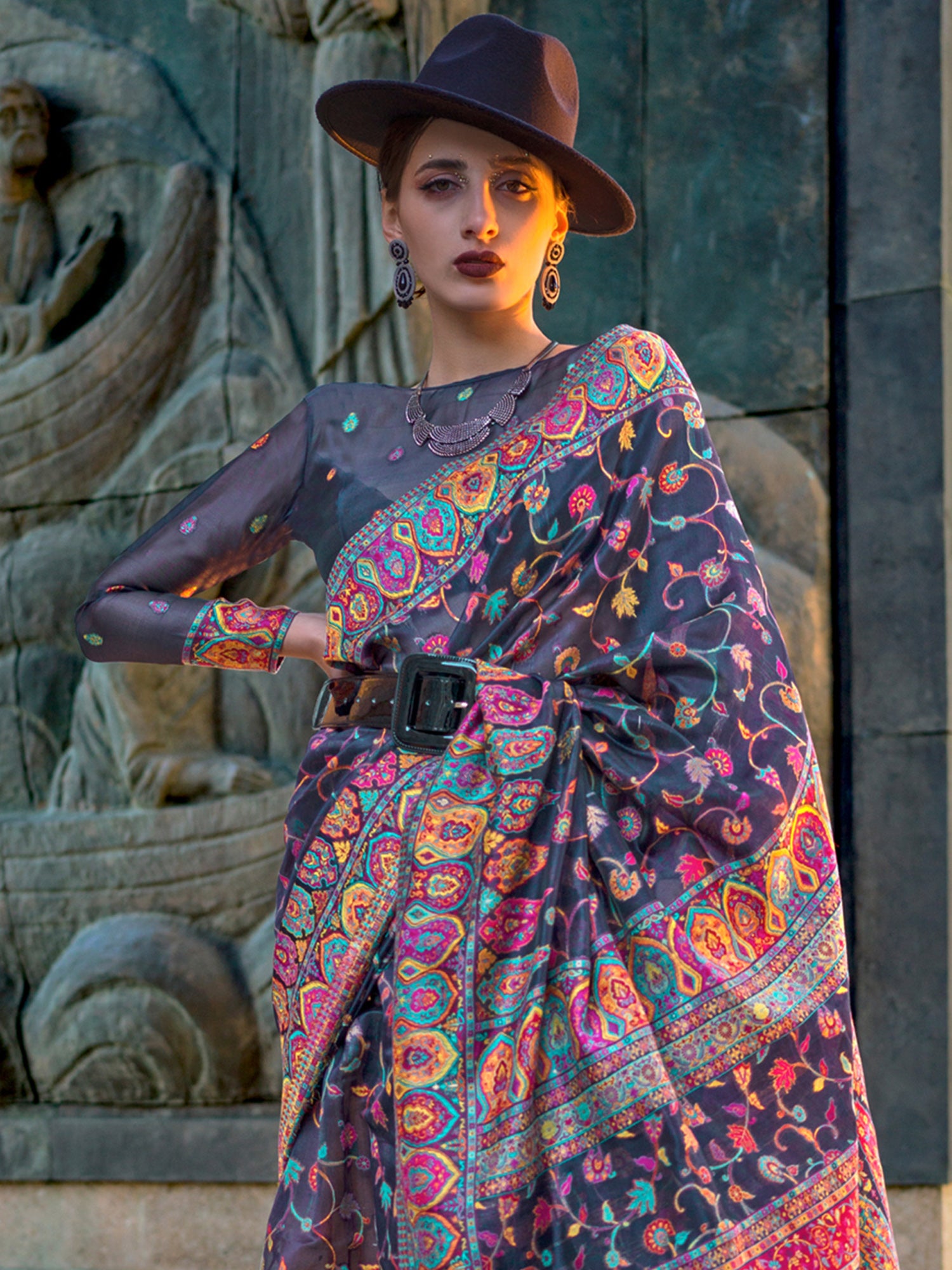 Women's Organza Grey Woven Design Designer Saree With Blouse Piece