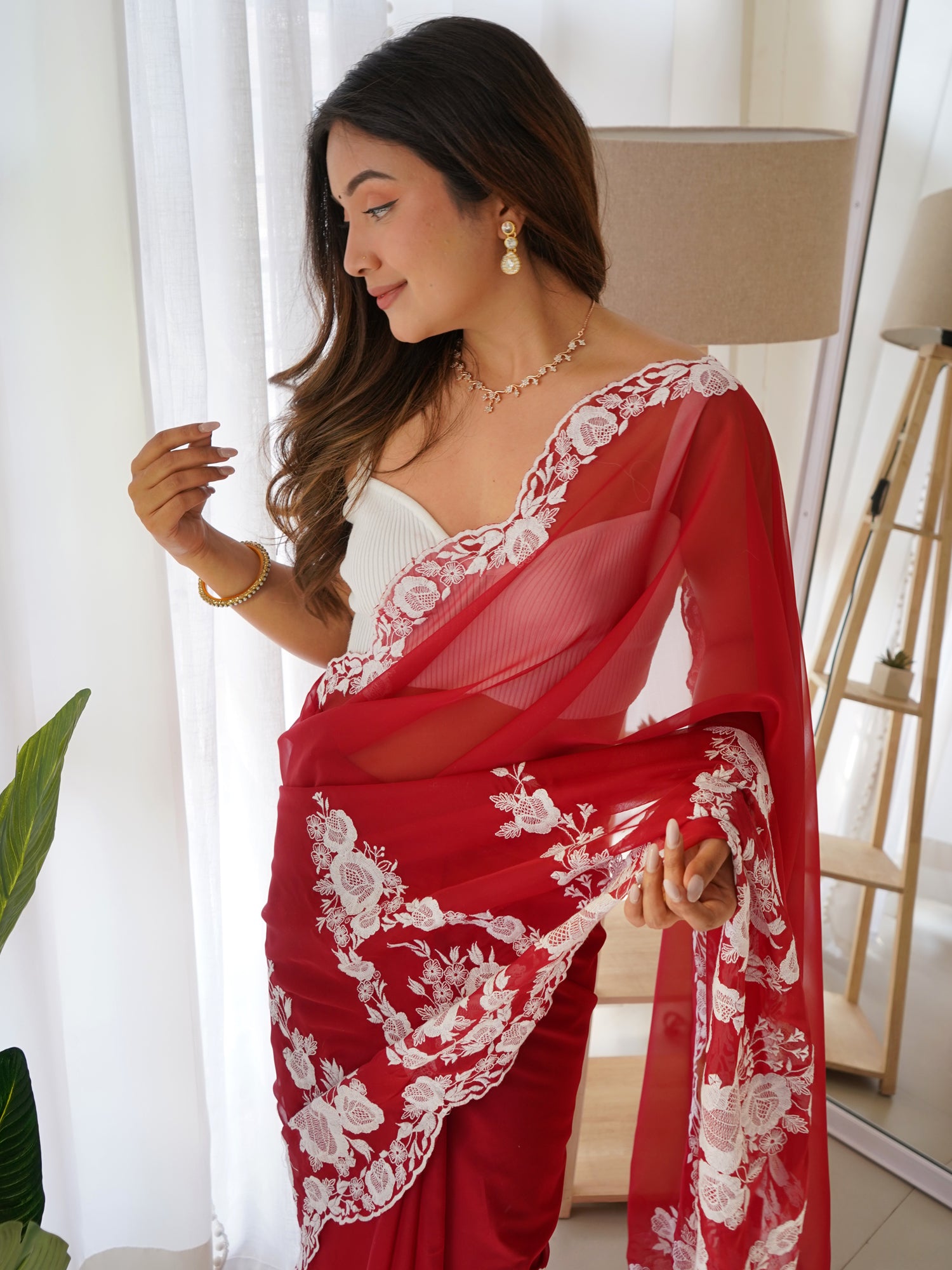 Women's Organza Maroon Embroidered Designer Saree With Blouse Piece