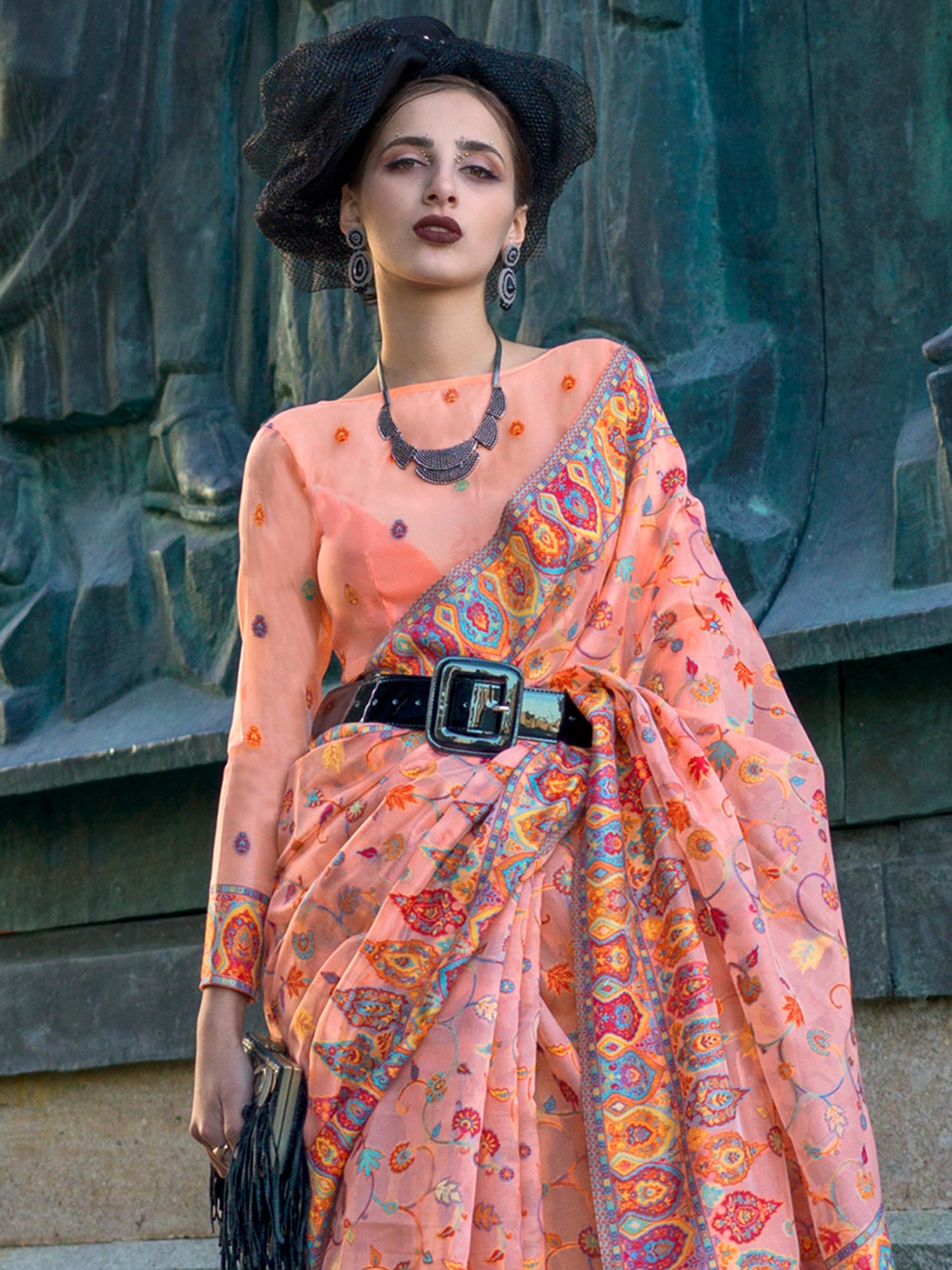 Women's Organza Peach Woven Design Designer Saree With Blouse Piece