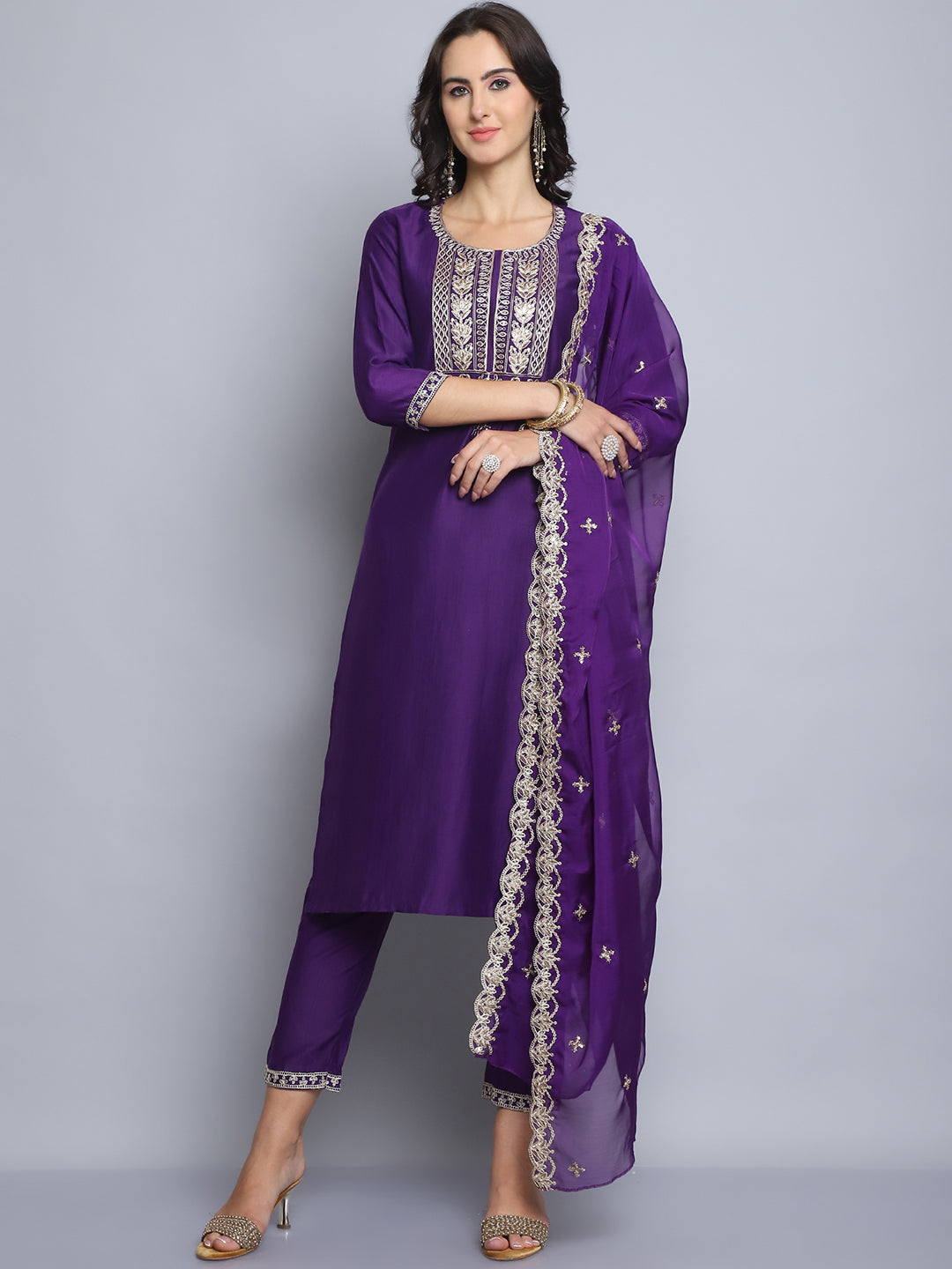 Women Purple Embroidery silk Kurta And Pant Set With Dupatta