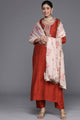 Dhiyona VA Women's Rust Ethnic Motifs Embroidered Dupion Silk Kurta with Trousers & With Dupatta