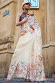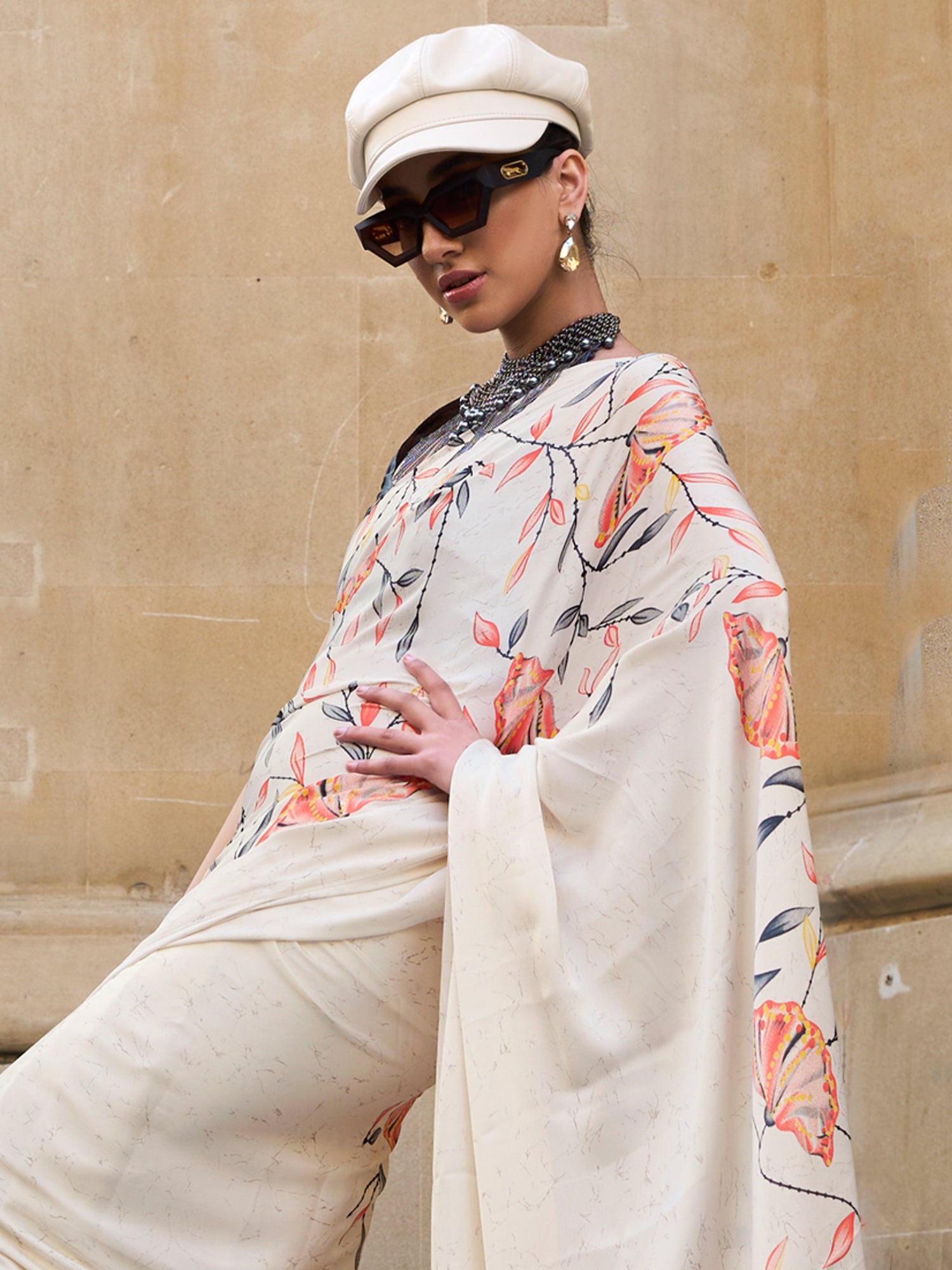 Women's Satin Cream Printed Designer Saree With Blouse Piece