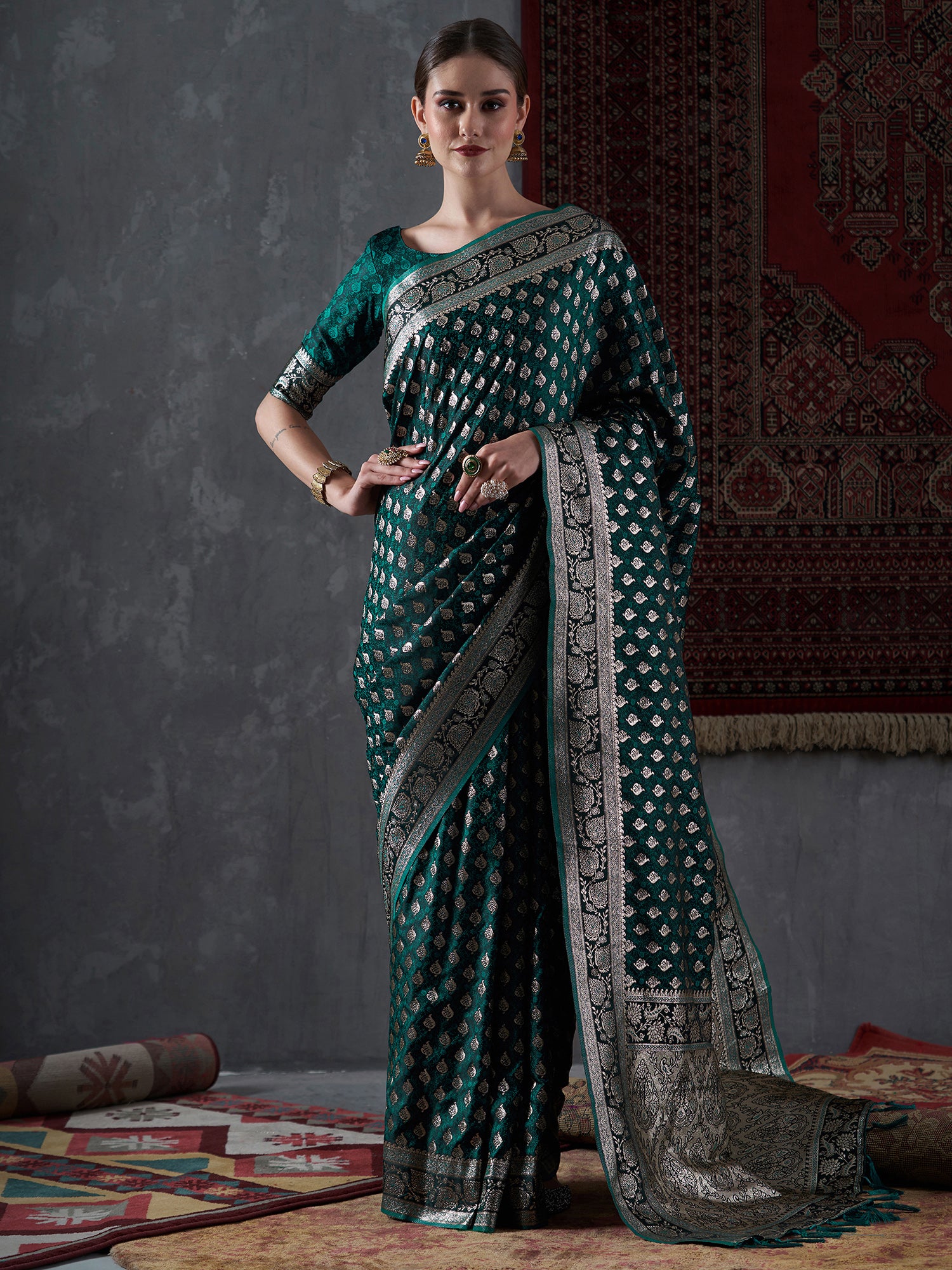 Women's Satin Silk Green Woven Design Designer Saree With Blouse Piece