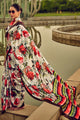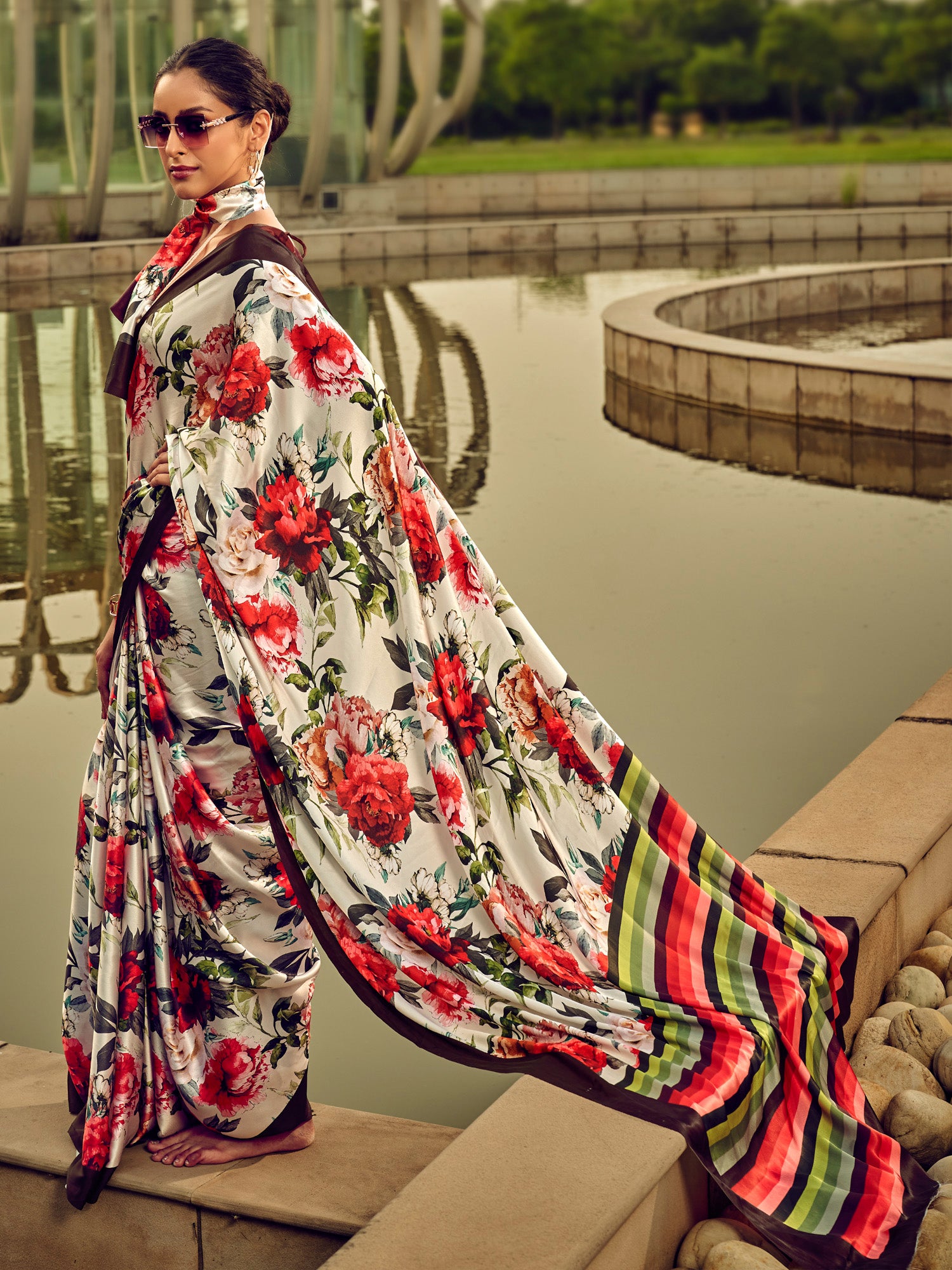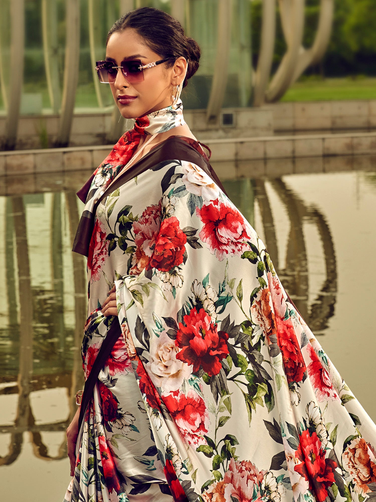 Women's Satin Silk Off White Printed Designer Saree With Blouse Piece