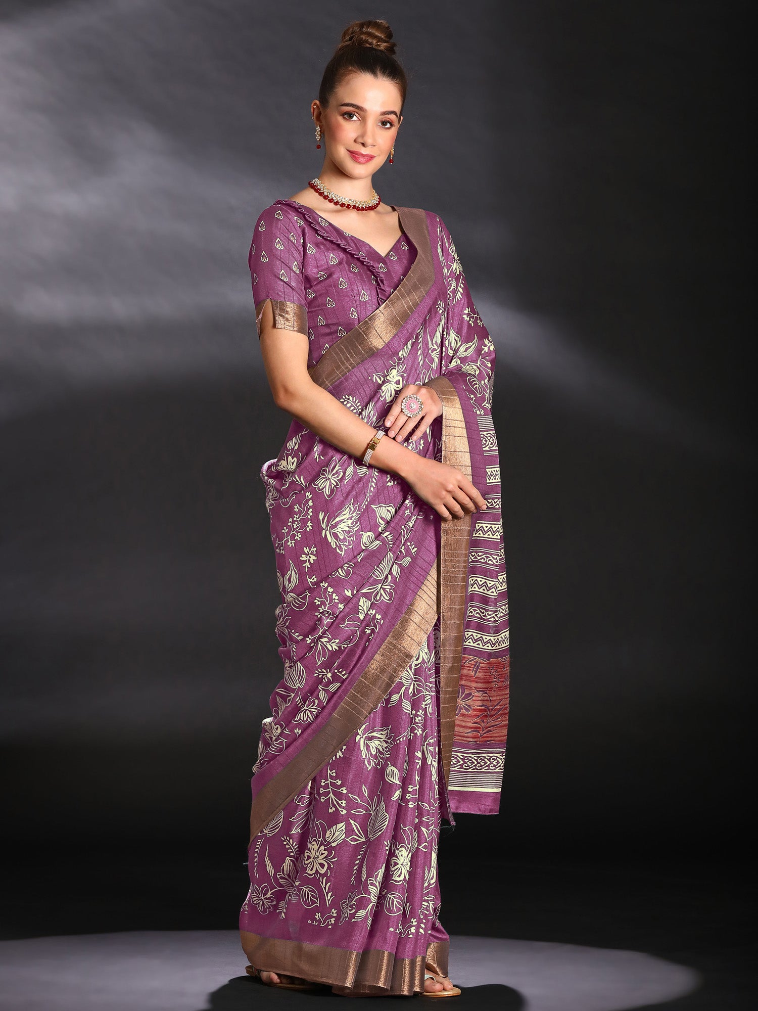 Women's Silk Blend Magenta Printed Designer Saree With Blouse Piece