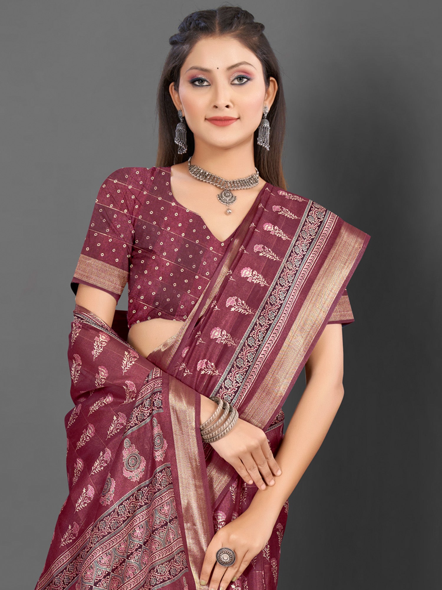 Women's Silk Blend Magenta Printed Designer Saree With Blouse Piece
