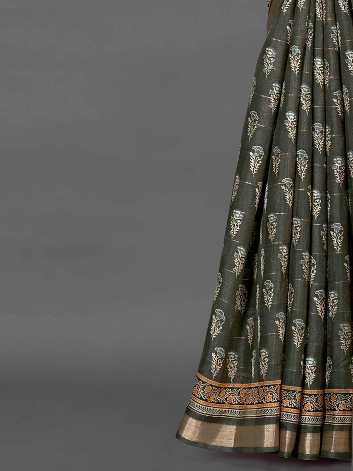 Women's Silk Blend Olive Printed Designer Saree With Blouse Piece