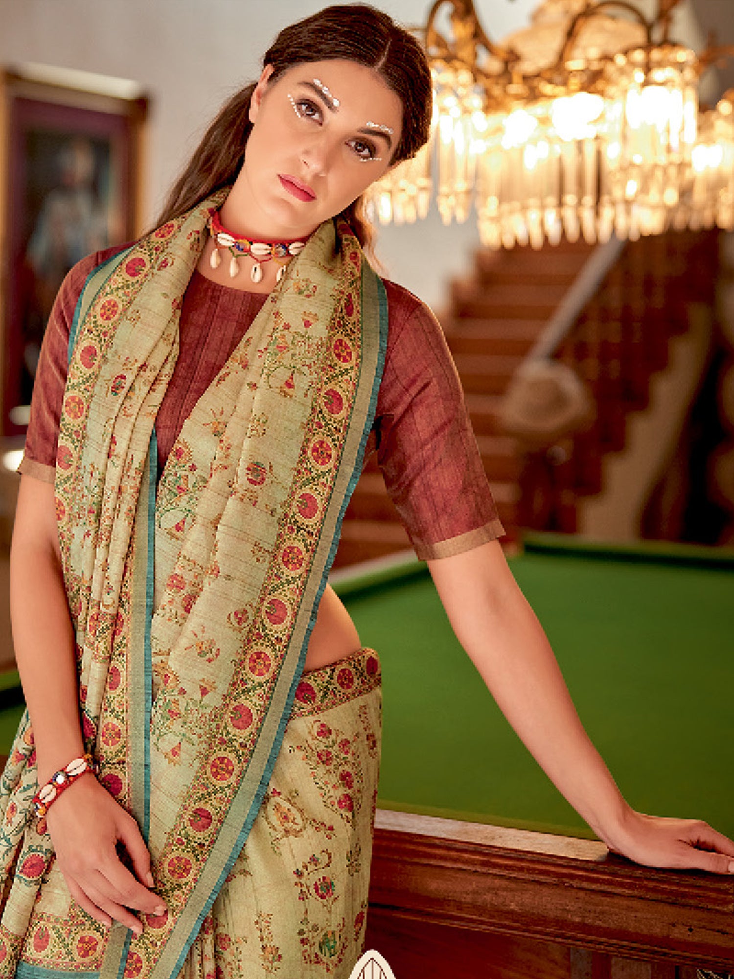 Women's Soft Silk Beige Printed Designer Saree With Blouse Piece