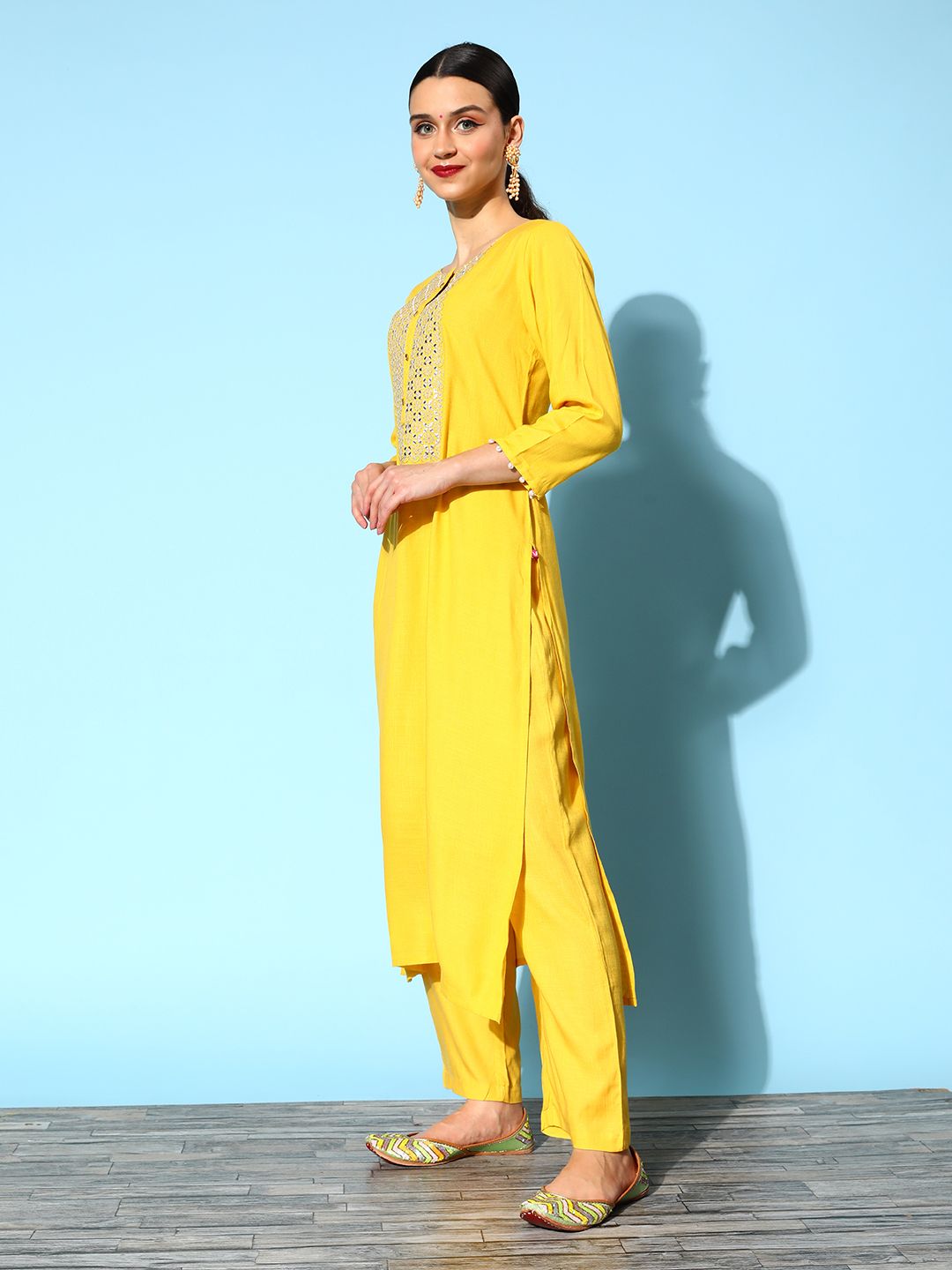 Pick this chic kurta set and stand out anywhere you go. It comes with a round neck and attractive calf length for an elevated appeal.