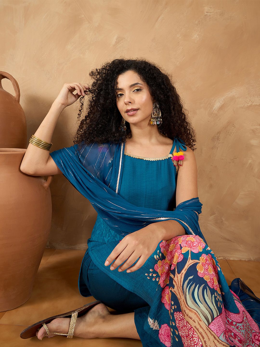 Dhiyona VA Women's Spaghetti Tie up Strap Straight Floral Kurta with Trousers and Dupatta