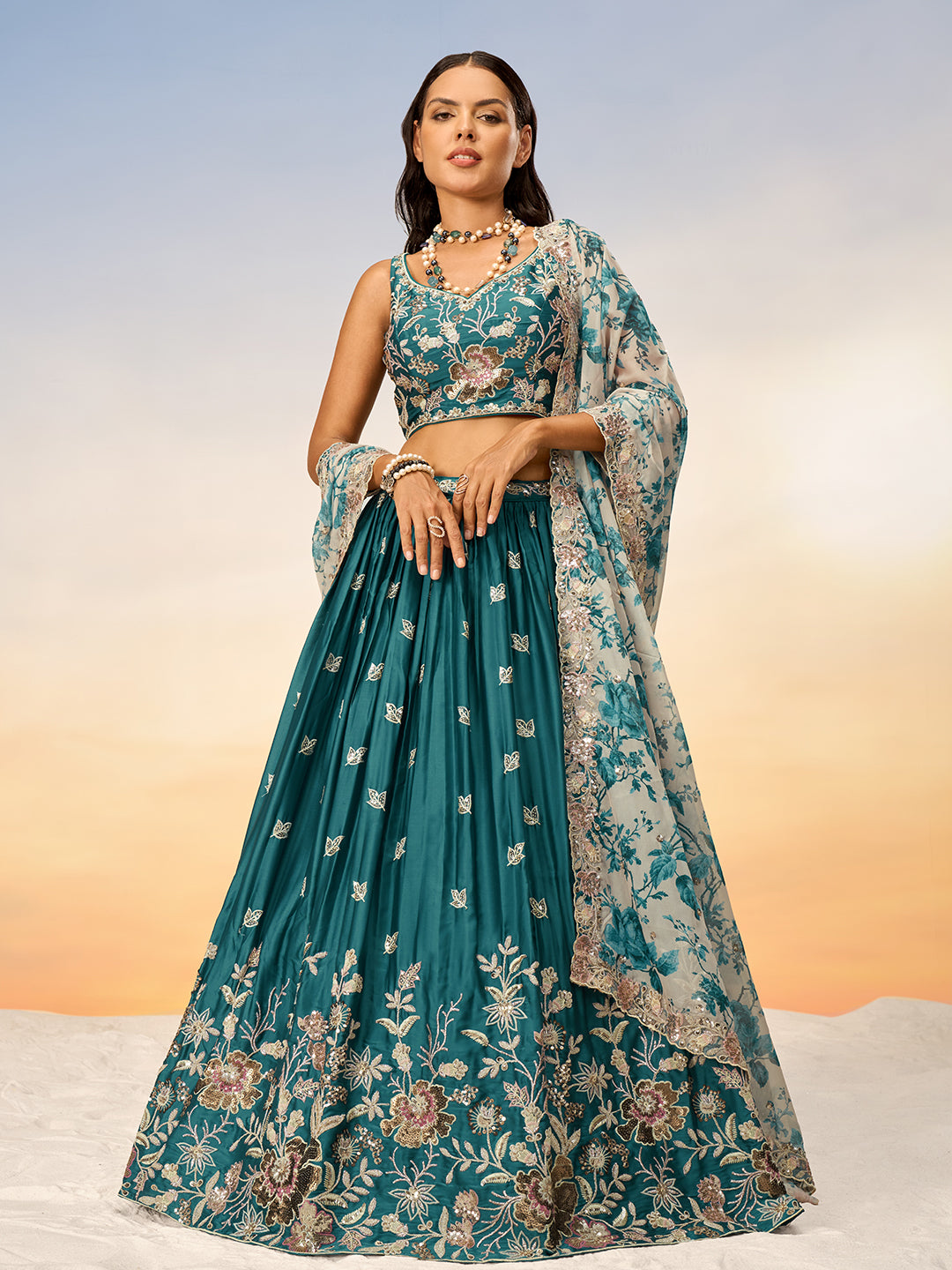 Teal Satin silk Sequins embroidery Semi-Stitched Lehenga choli & Dupatta