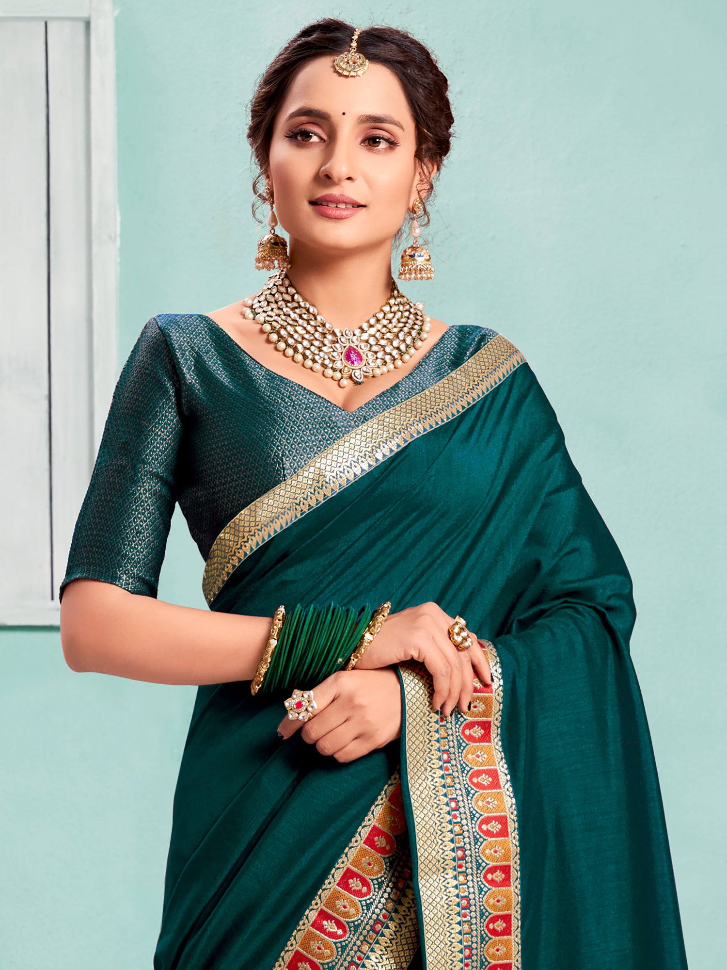 Women's Vichitra Silk Teal blue Embellished Designer Saree With Blouse Piece