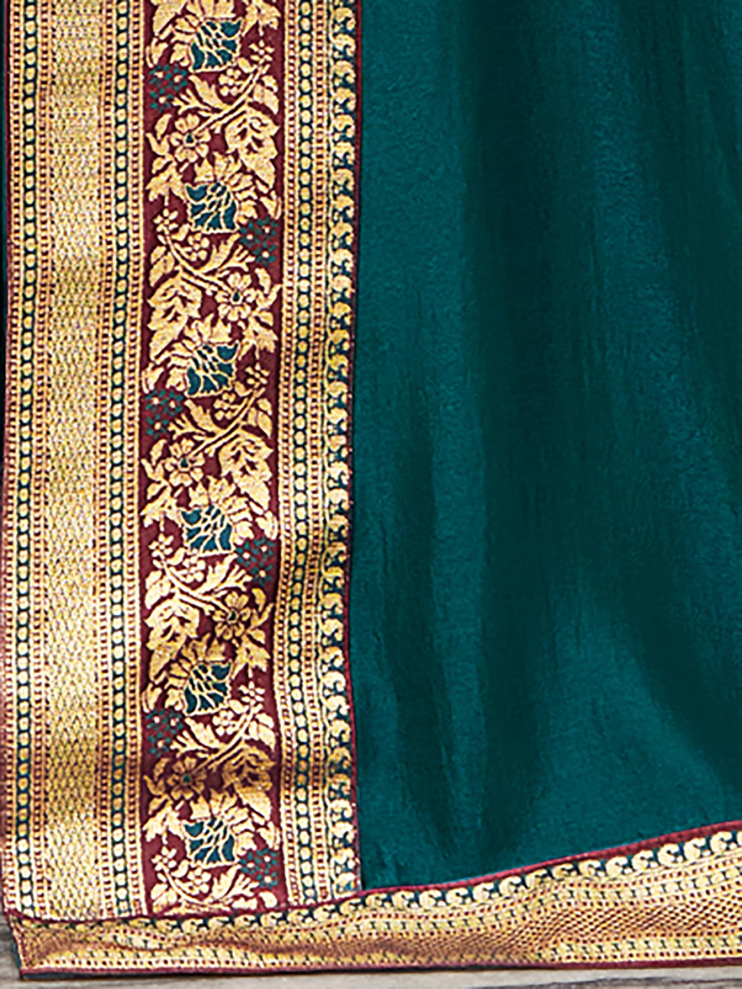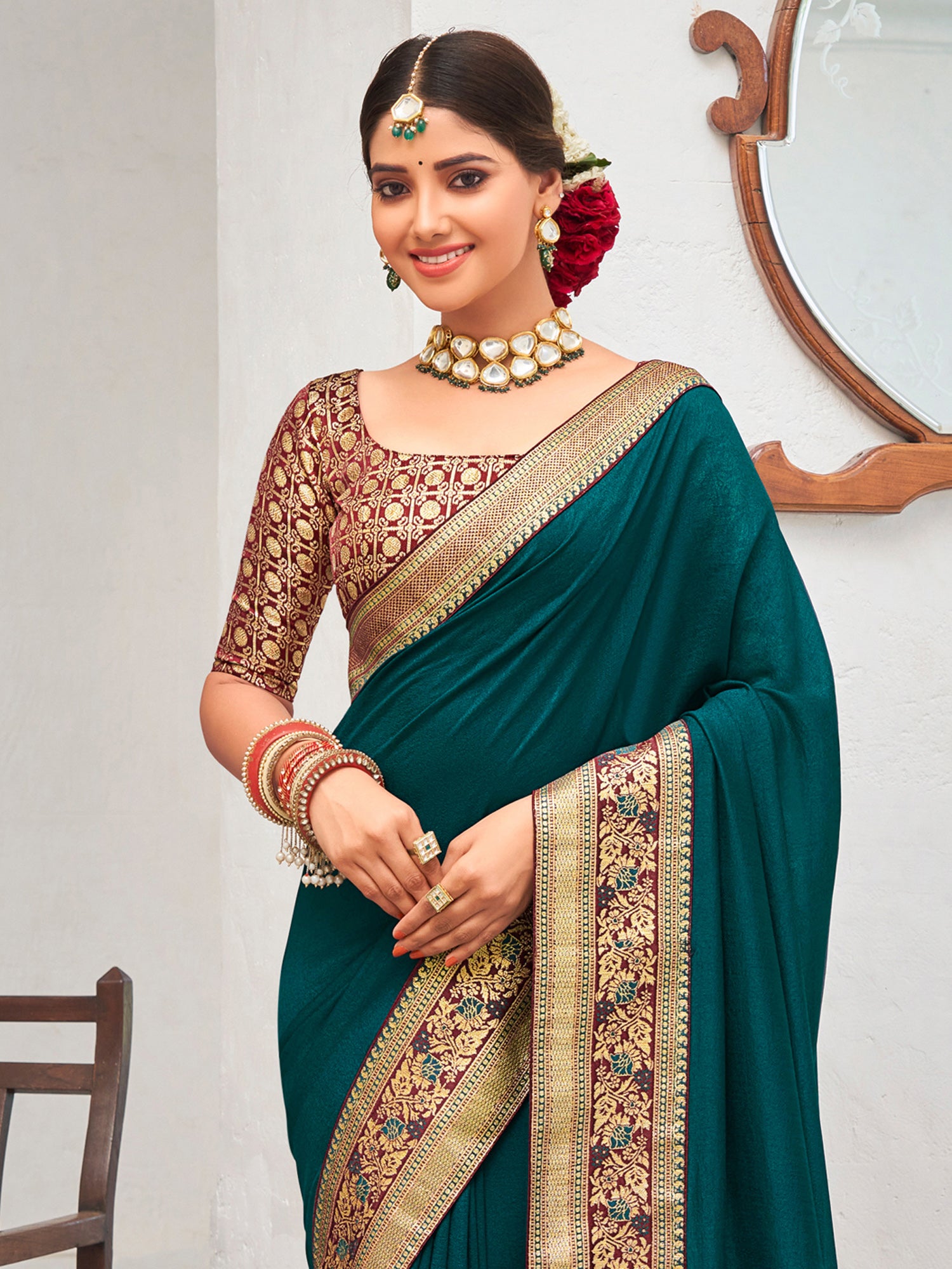 Women's Vichitra Silk Teal blue Embellished Designer Saree With Blouse Piece