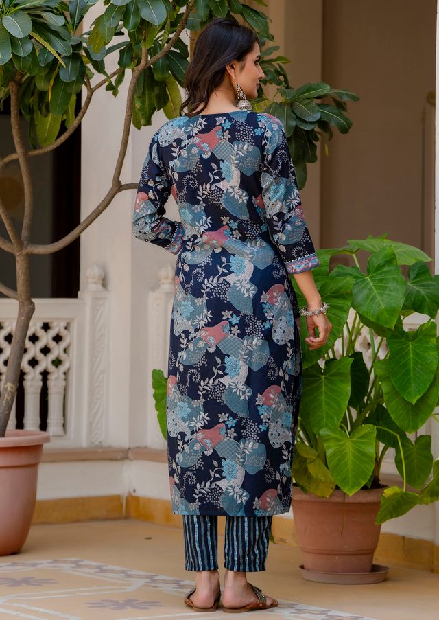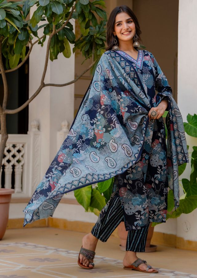 Description: This women’s viscose blue A-line kurta and pant set exudes charm and style, featuring a flowy silhouette and a matching dupatta that adds a touch of elegance. Perfect for day-to-night wear, it’s a versatile choice for any occasion.