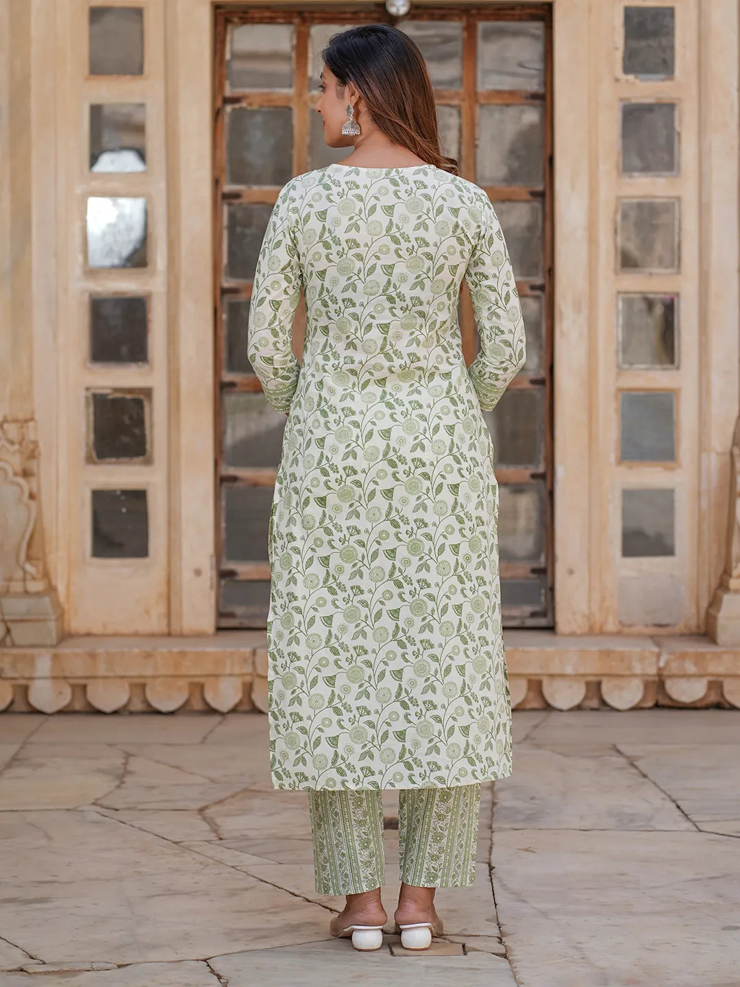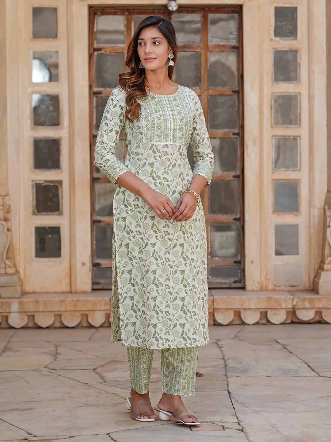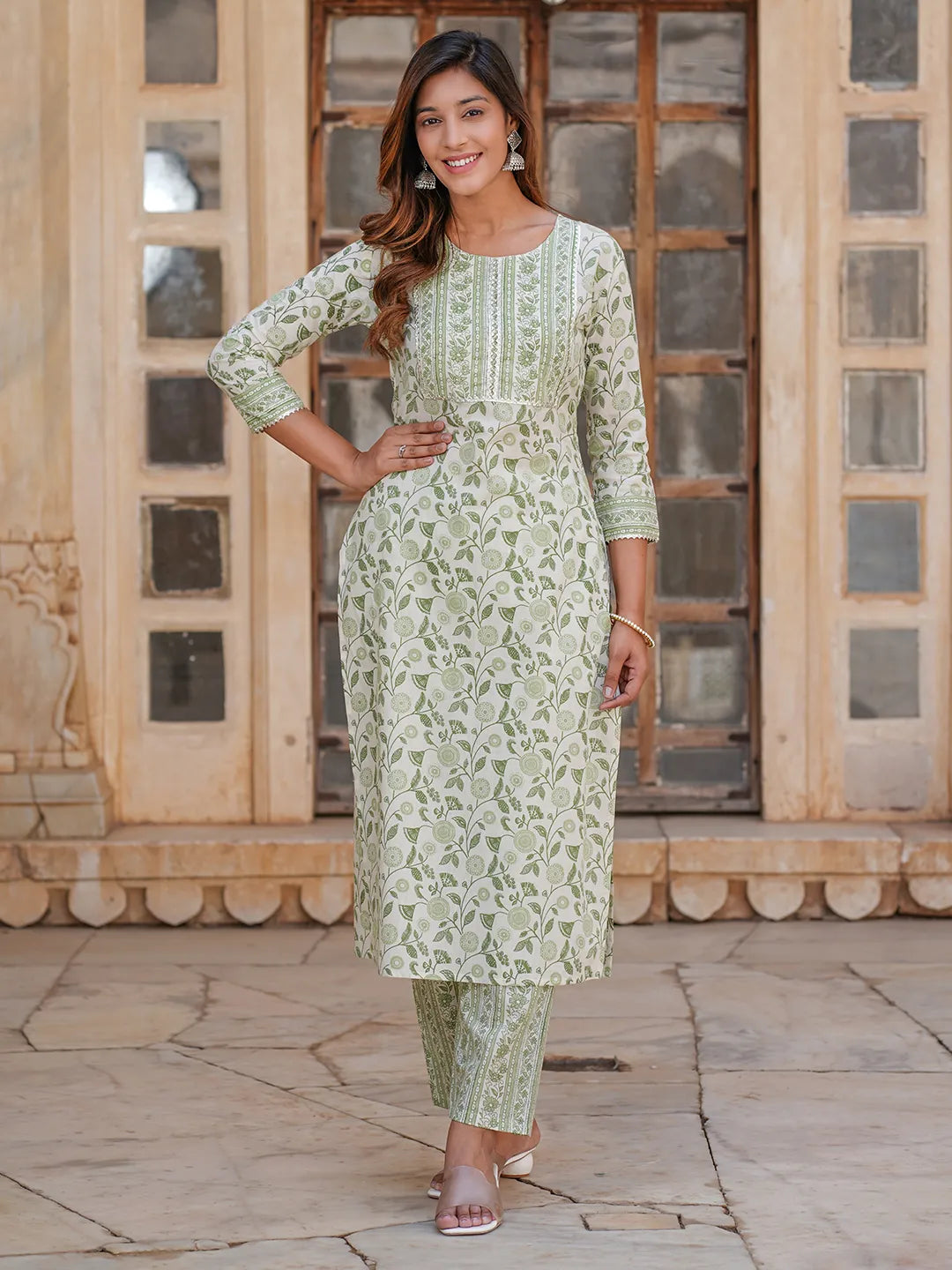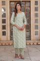 Women White And Green Floral Straight Kurta Pant Set