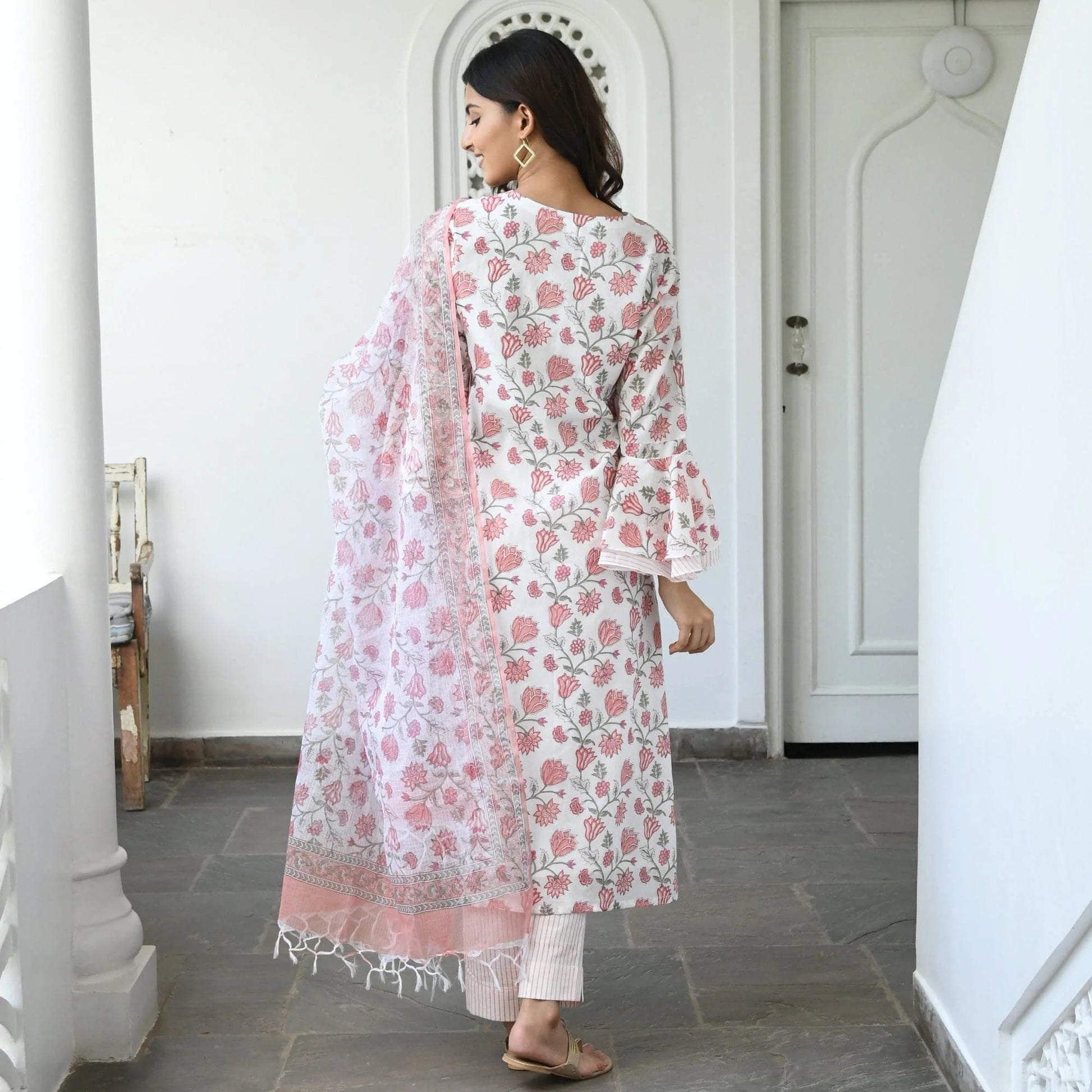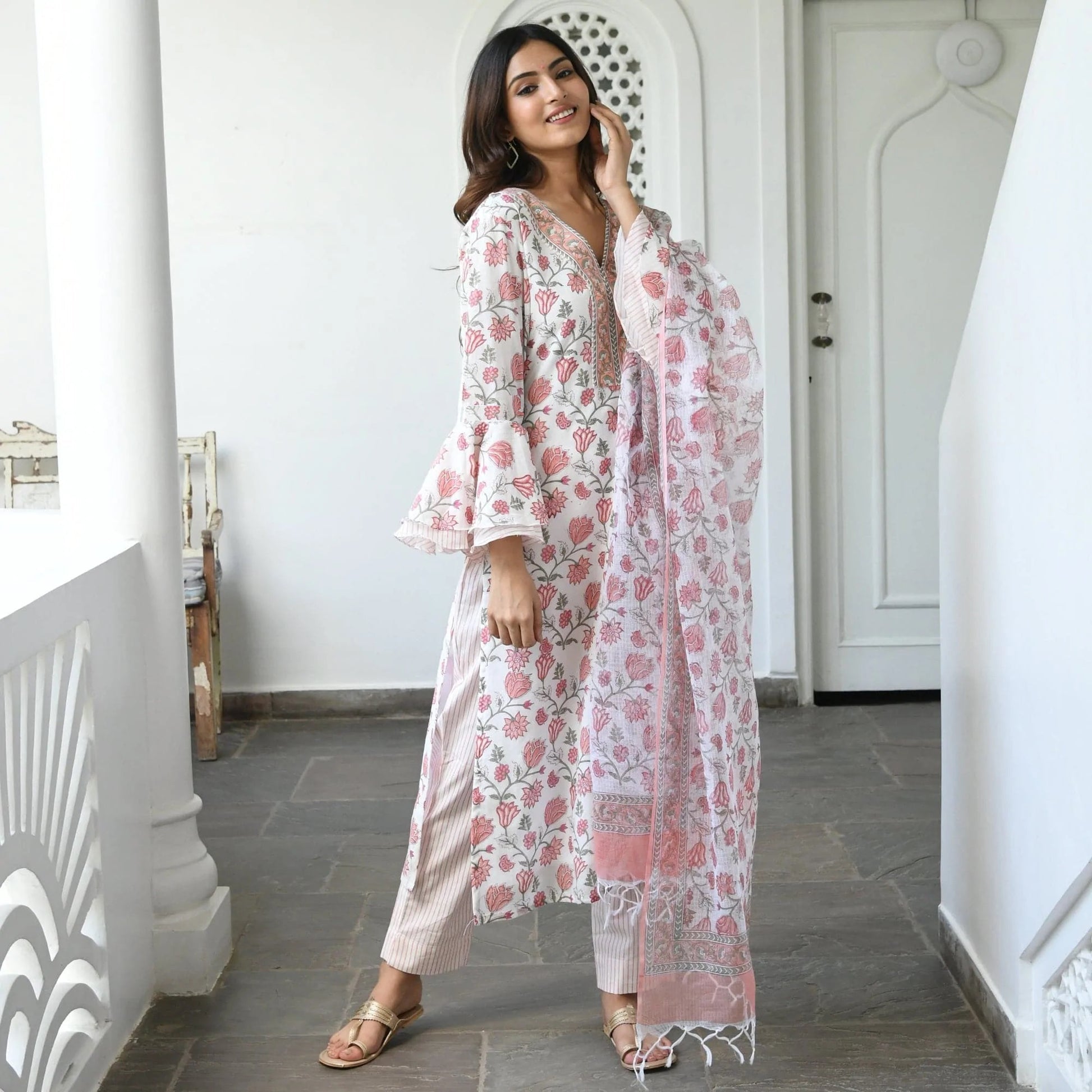 The women kurta set is the perfect blend of effortless style and comfort. Thoughtfully crafted with love, it features intricate patterns and vibrant colors that bring a chic and coordinated look. This versatile ensemble is ideal for both casual and festive occasions. With its flattering fit and timeless design, it seamlessly merges tradition with modern flair, making it a staple piece in any wardrobe.Color: White||Kurta Material: Pure Cotton||Bottom Material: Pure Cotton||Dupatta Material: Pure Cotton||Pattern: Floral||Kurti Length: Regular Fit||Sleeve Type: Calf||Occasion: Casual||Neck Type: V-neck