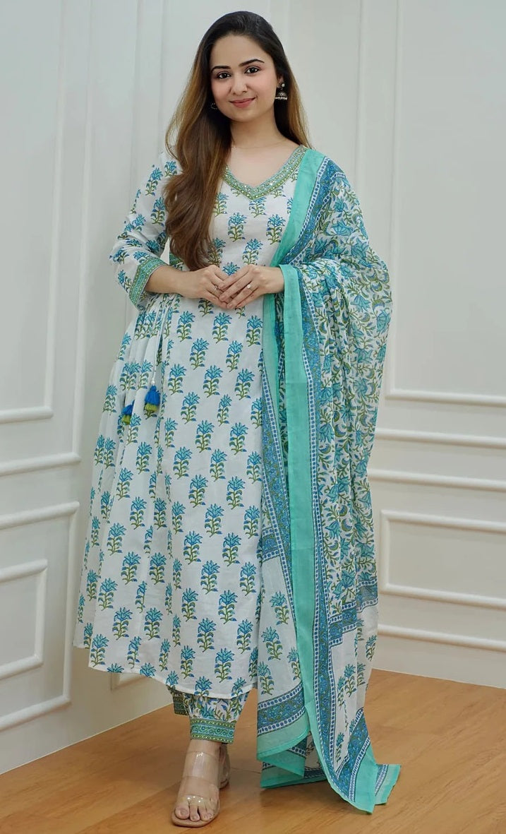 The women kurta set is the perfect blend of effortless style and comfort. Thoughtfully crafted with love, it features intricate patterns and vibrant colors that bring a chic and coordinated look. This versatile ensemble is ideal for both casual and festive occasions. With its flattering fit and timeless design, it seamlessly merges tradition with modern flair, making it a staple piece in any wardrobe.Color: White||Kurta Material: Pure Cotton||Bottom Material: Pure Cotton||Dupatta Material: Pure Cotton||Pattern: Printed||Kurti Length: Regular Fit||Sleeve Type: Calf||Occasion: Casual||Neck Type: V-neck