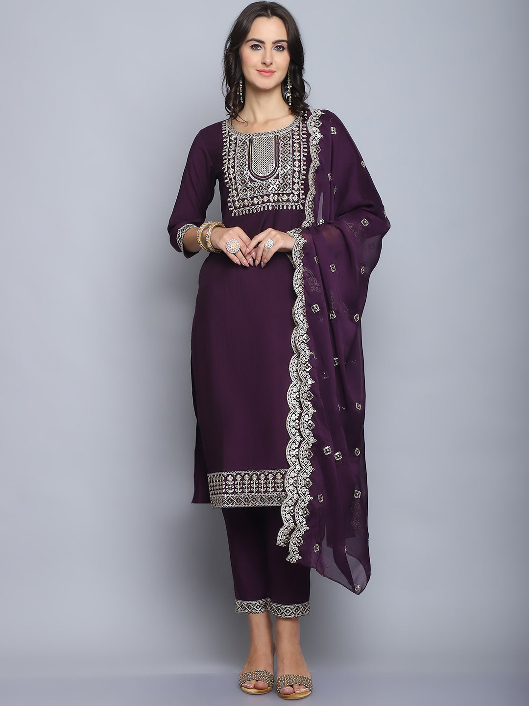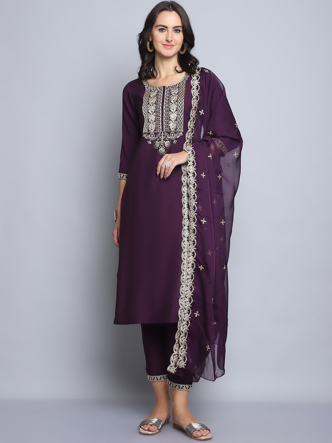 Women Wine Embroidery silk Kurta And Pant Set With Dupatta