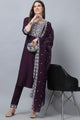 Women's Wine Embroidery silk Kurta, Pant And Dupatta Set