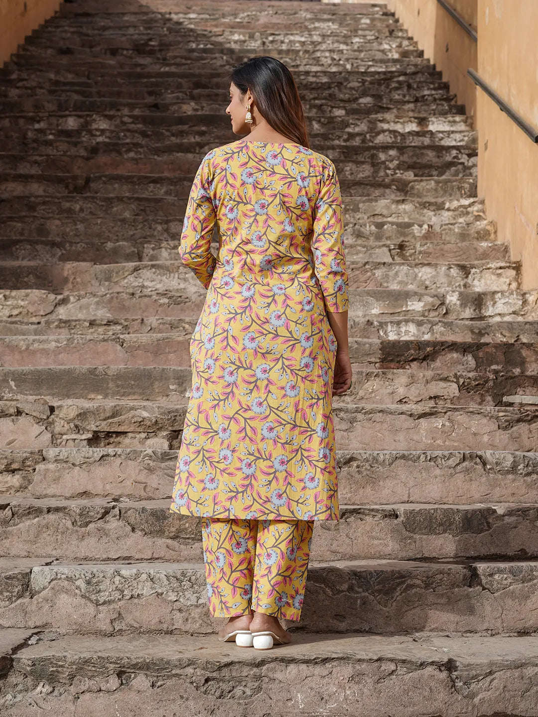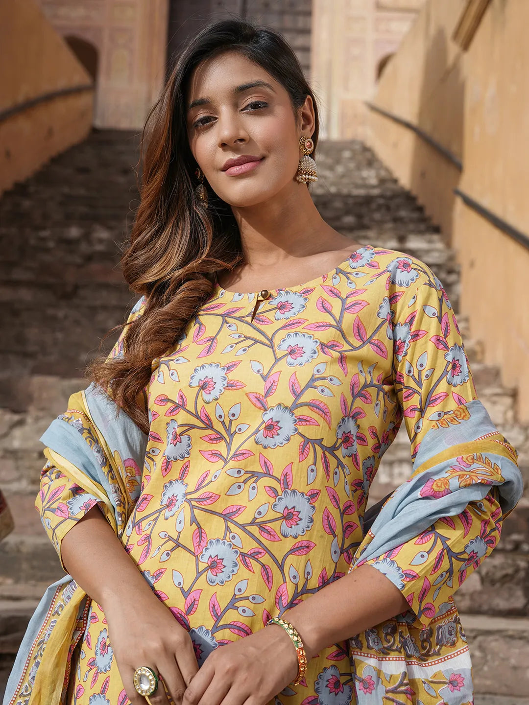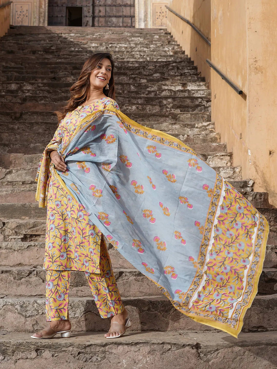 Women Yellow Floral Straight Kurta Pant and Dupatta Set