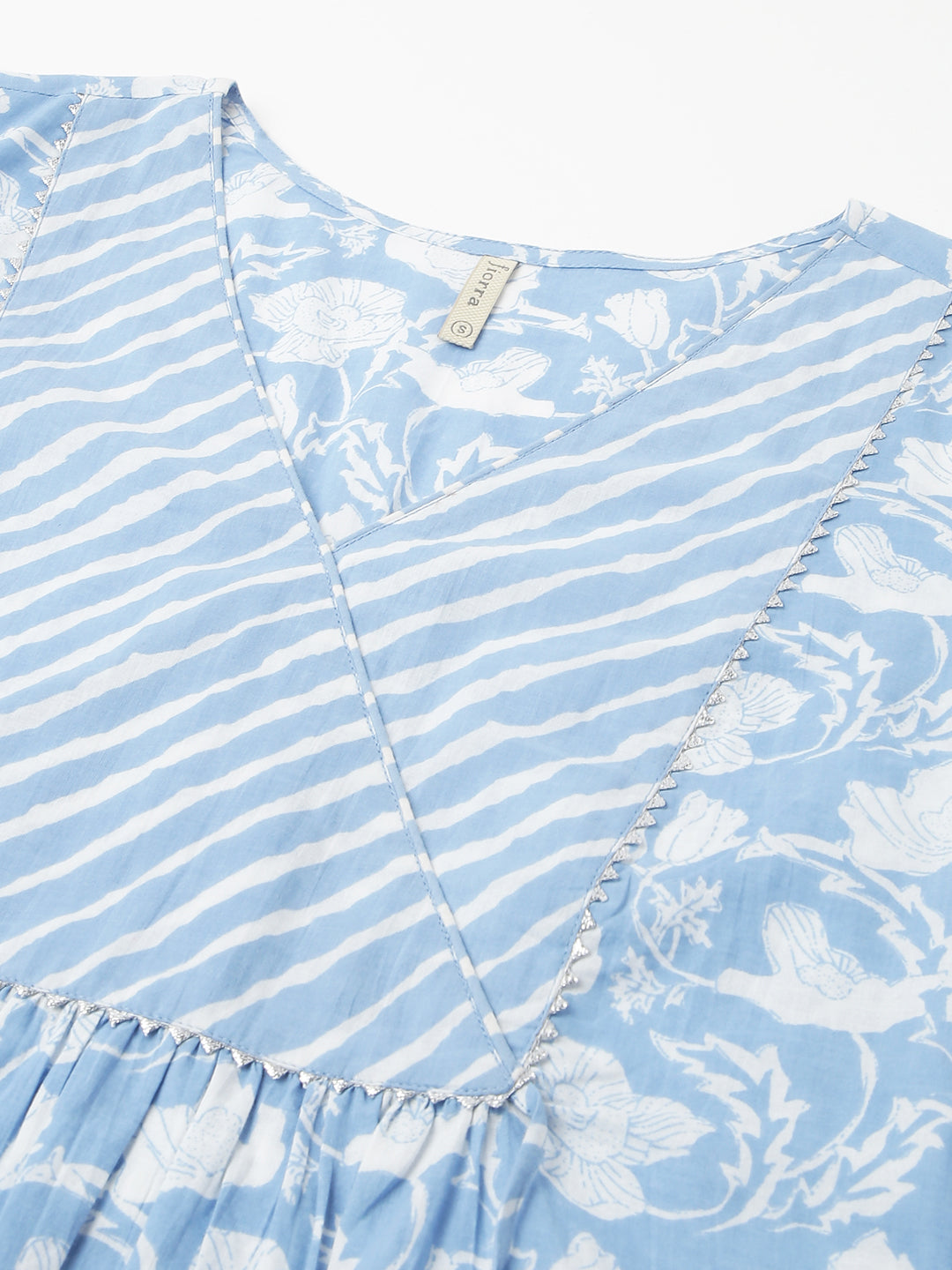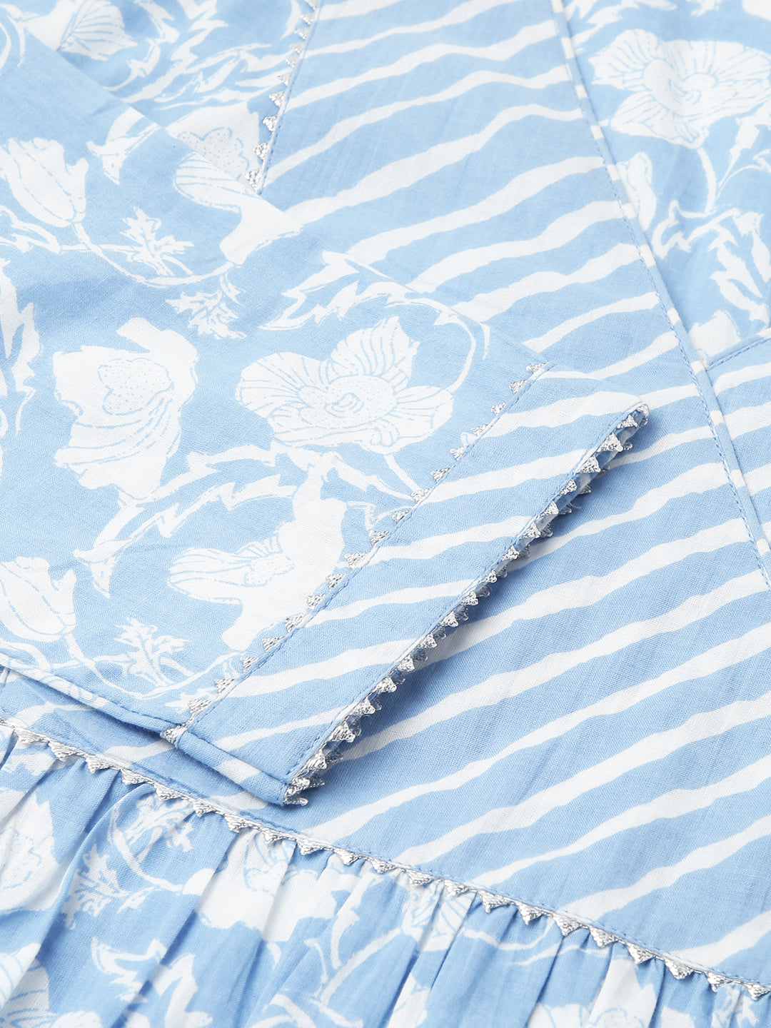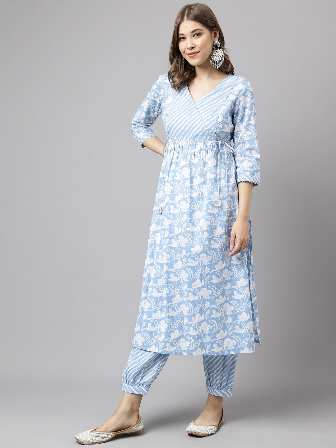 Blue and white Floral Printed Gotta Patti Pure Cotton Anarkali Kurta with Trousers & Dupatta