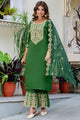 Women's Embroidered Silk Blend Calf Length Straight Kurta with Palazzo & Dupatta Set
