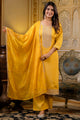 Women's Embroidered Silk Blend Calf Length Straight Kurta with Palazzo & Dupatta Set