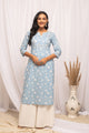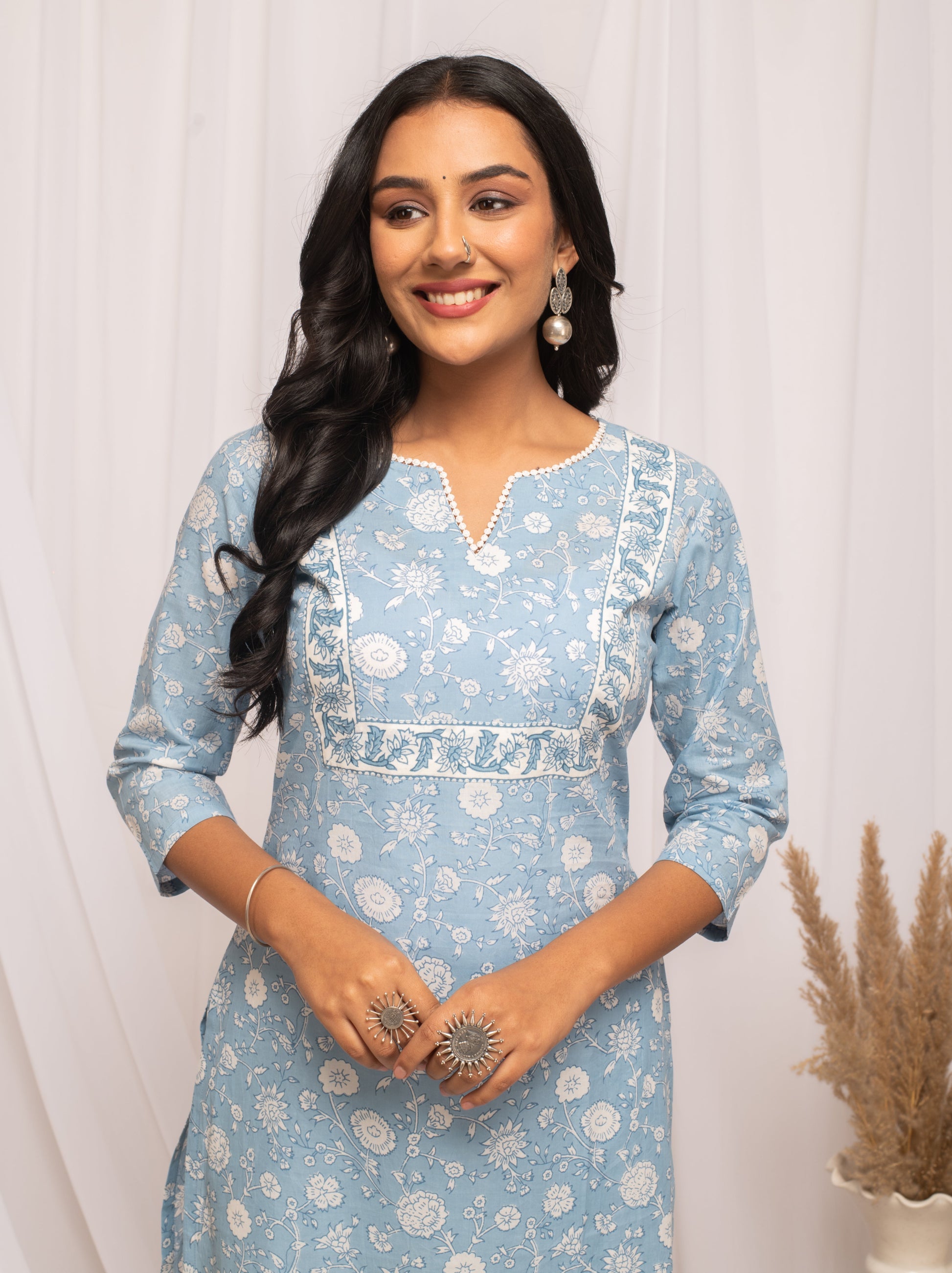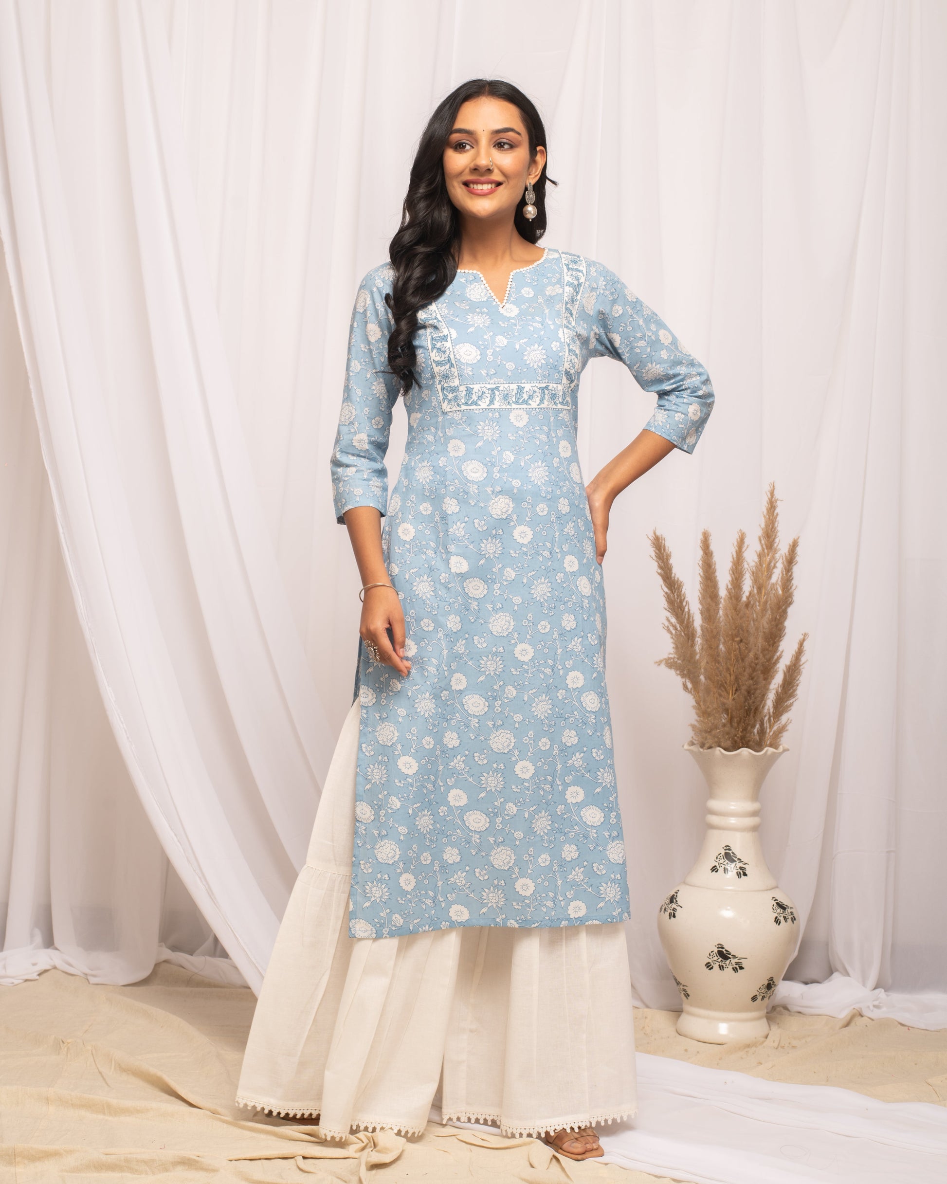 Women's Floral Printed Sky Blue Cotton Straight Kurta