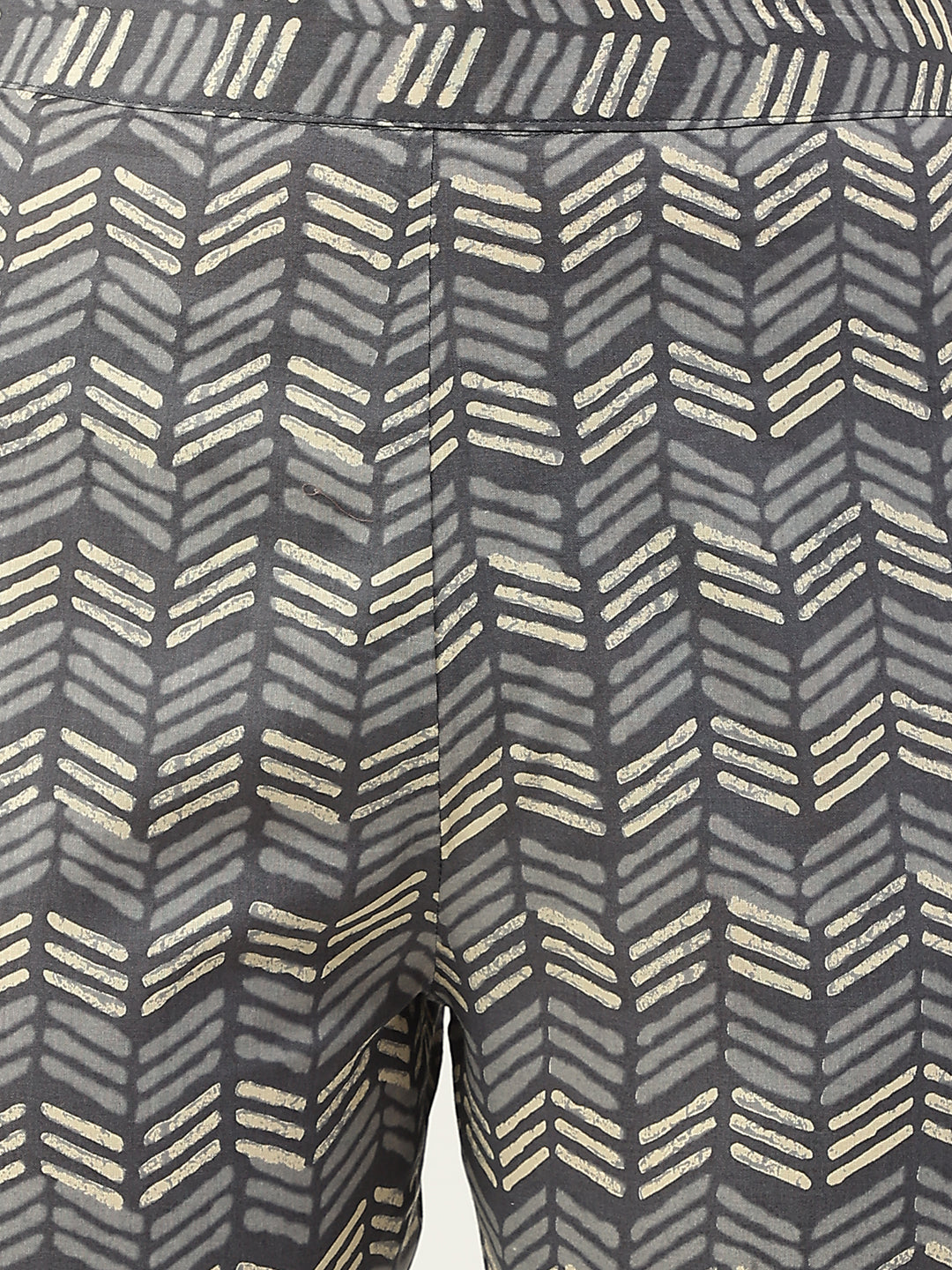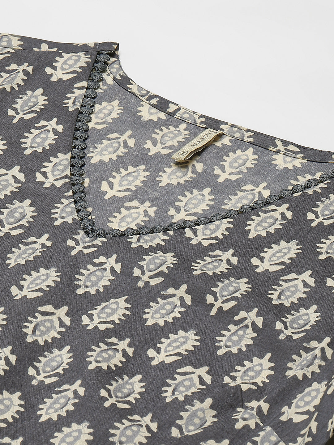 Grace your festive occasions with Fiorra’s sophisticated grey printed kurta set, designed to elevate your style with timeless elegance. Crafted from soft cotton, this calf-length kurta features a sleek V-neck and three-quarter sleeves, designed in a straight silhouette for timeless elegance. Paired with coordinating pants and a matching dupatta, this set seamlessly blends comfort and sophistication, perfect for festive and party occasions.