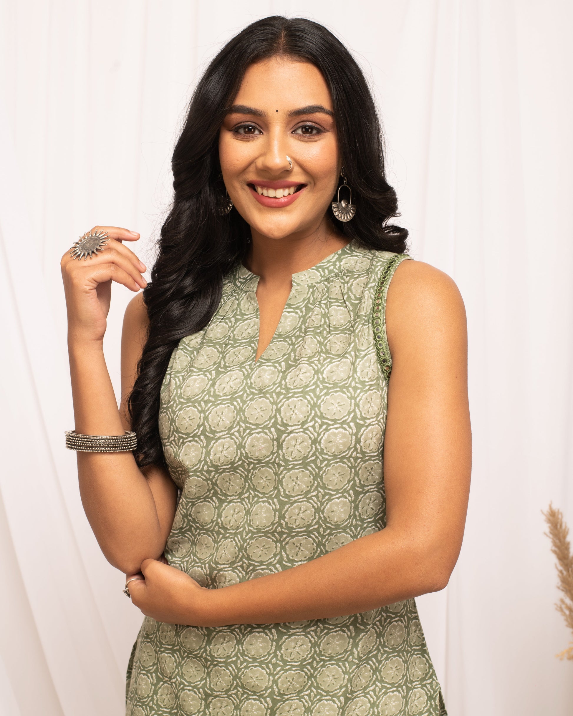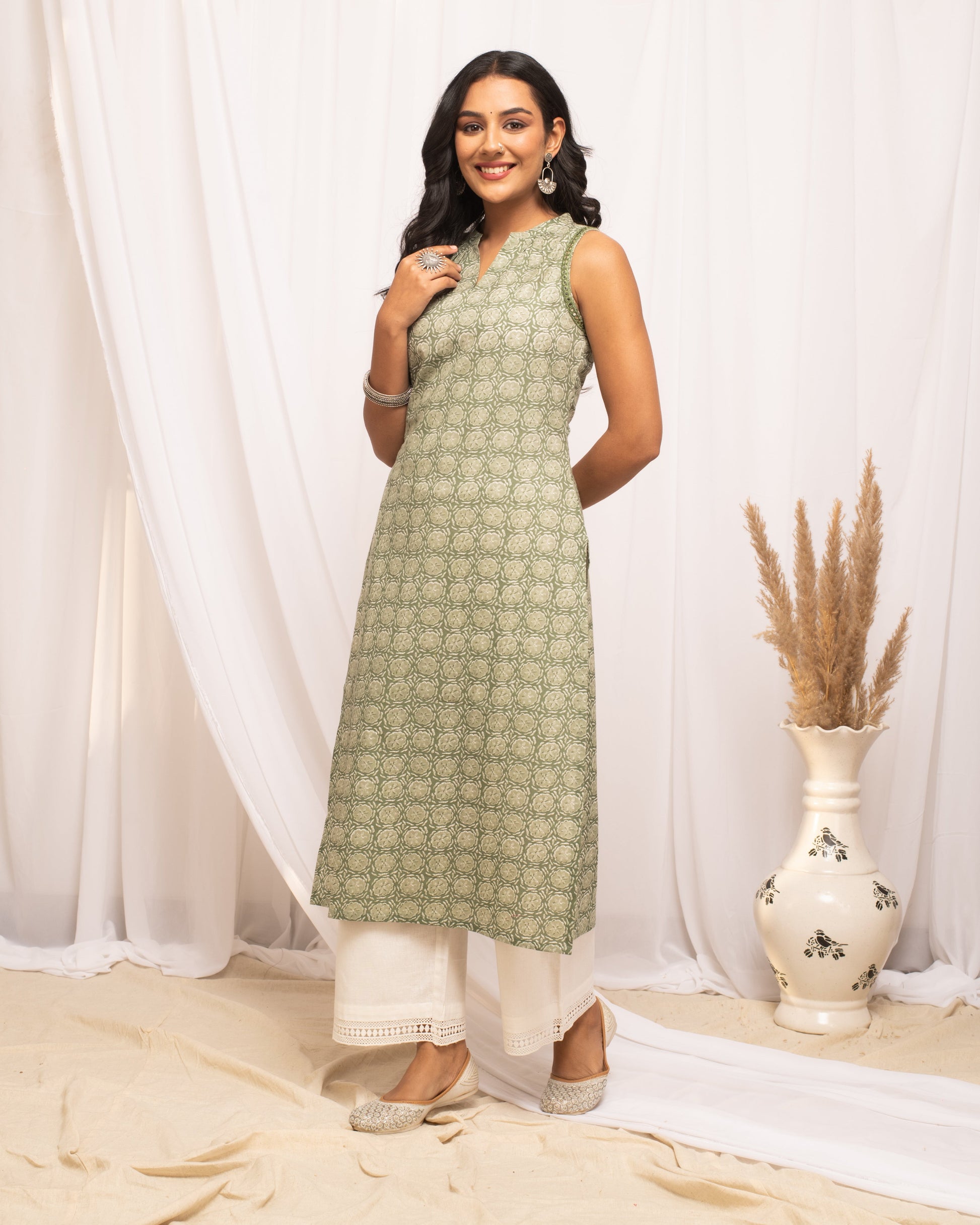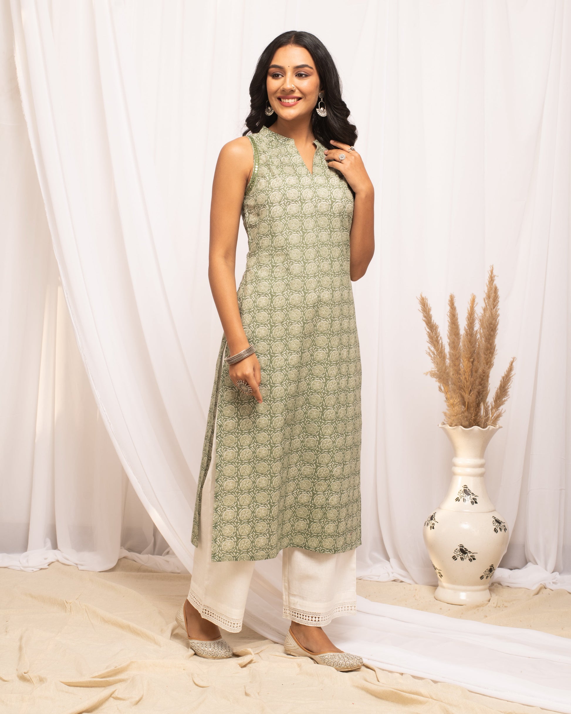 Refresh your look with Fiorra's light green cotton straight kurta, featuring a delicate floral print that adds a touch of elegance and charm. Its soft hue and graceful design make it an ideal choice for effortless style.