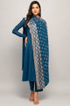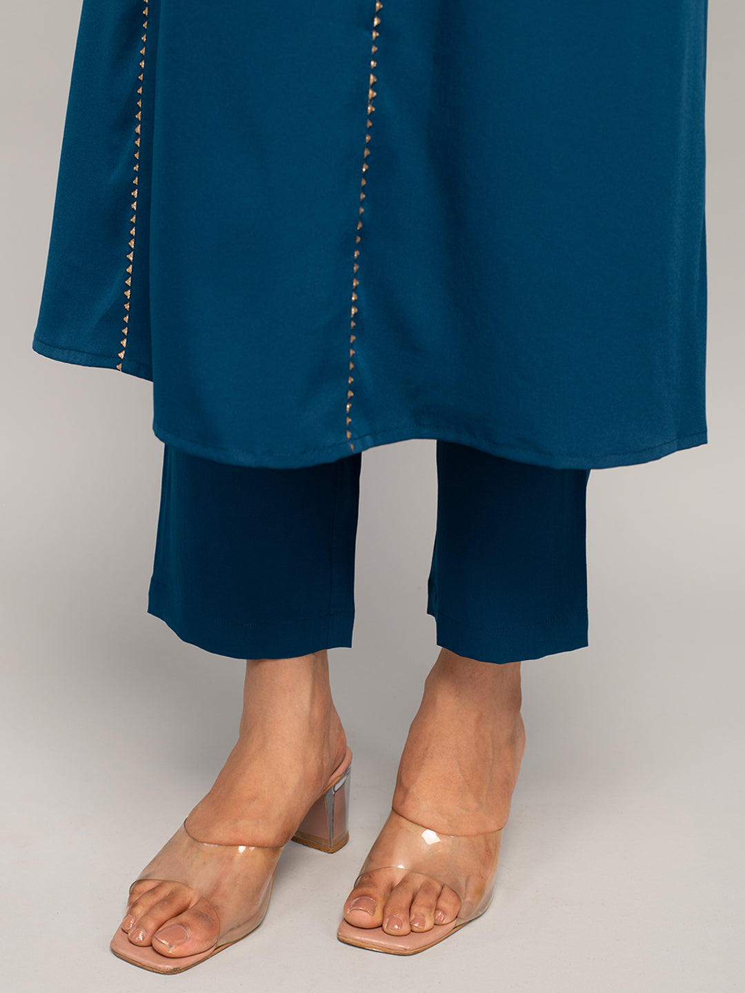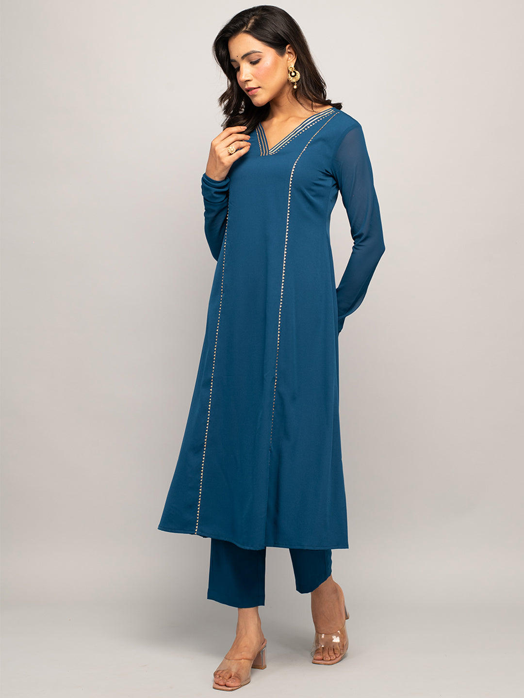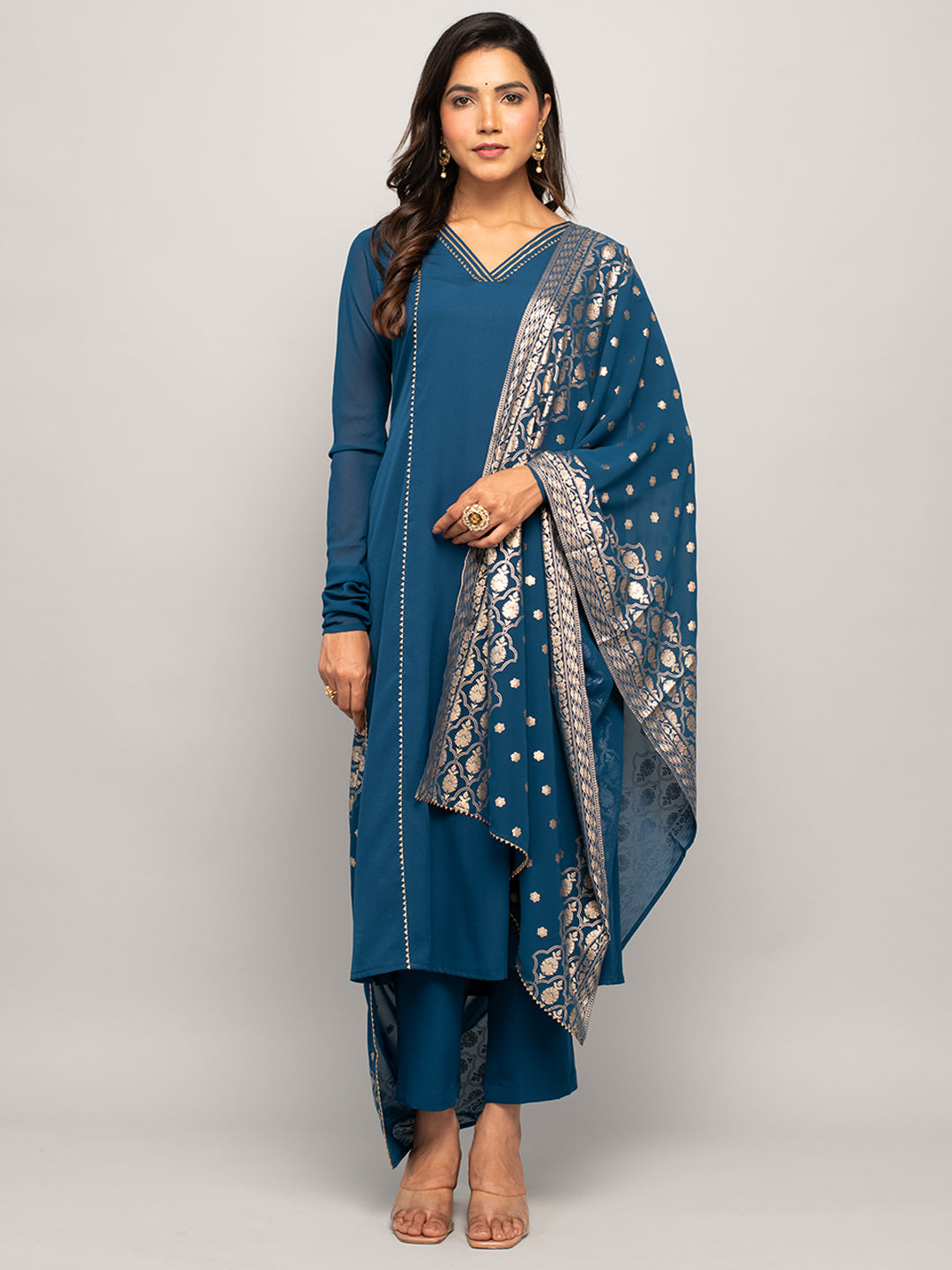 Women's Teal Blue Crepe A-line Kurta with Pant and Dupatta