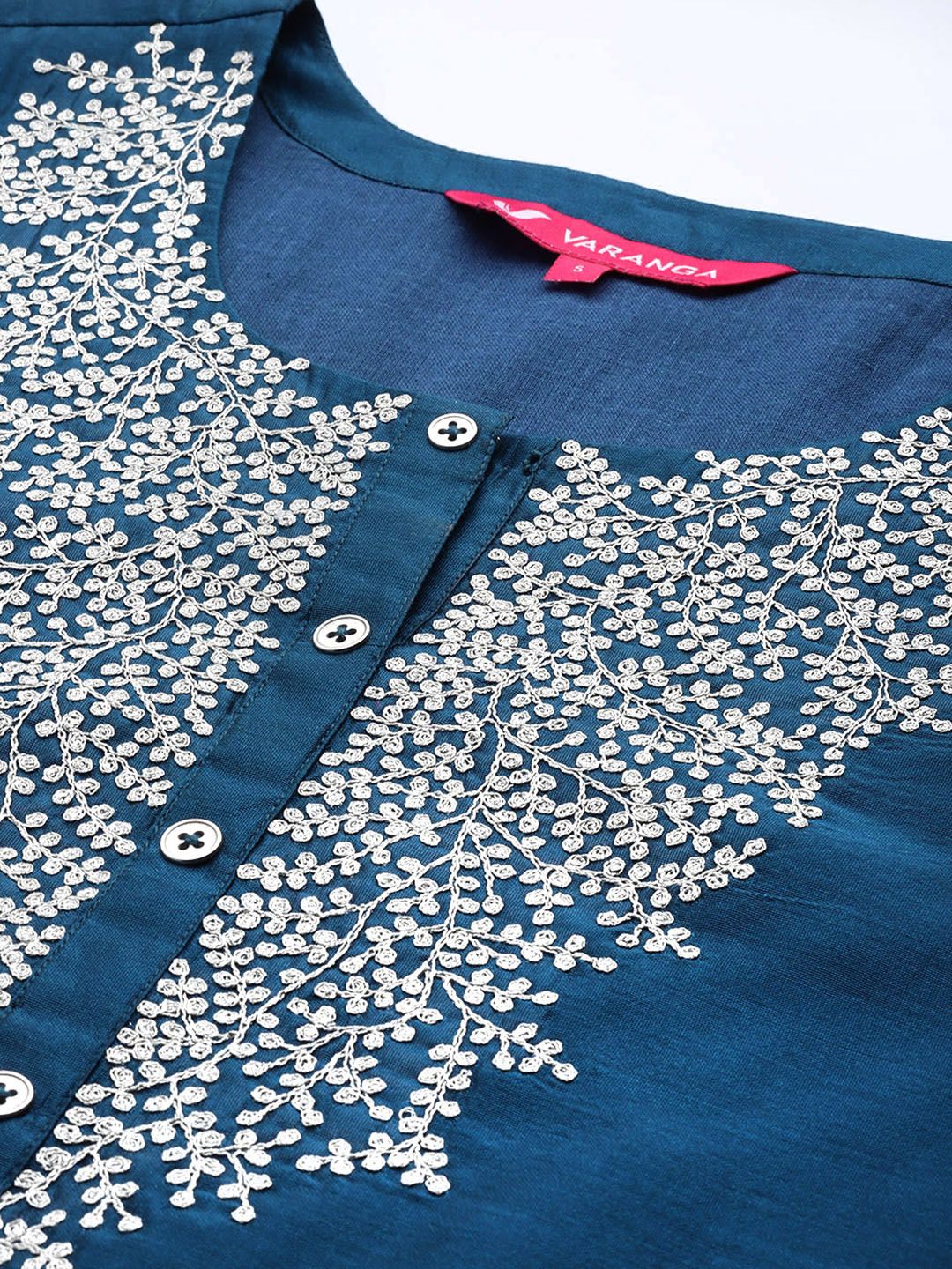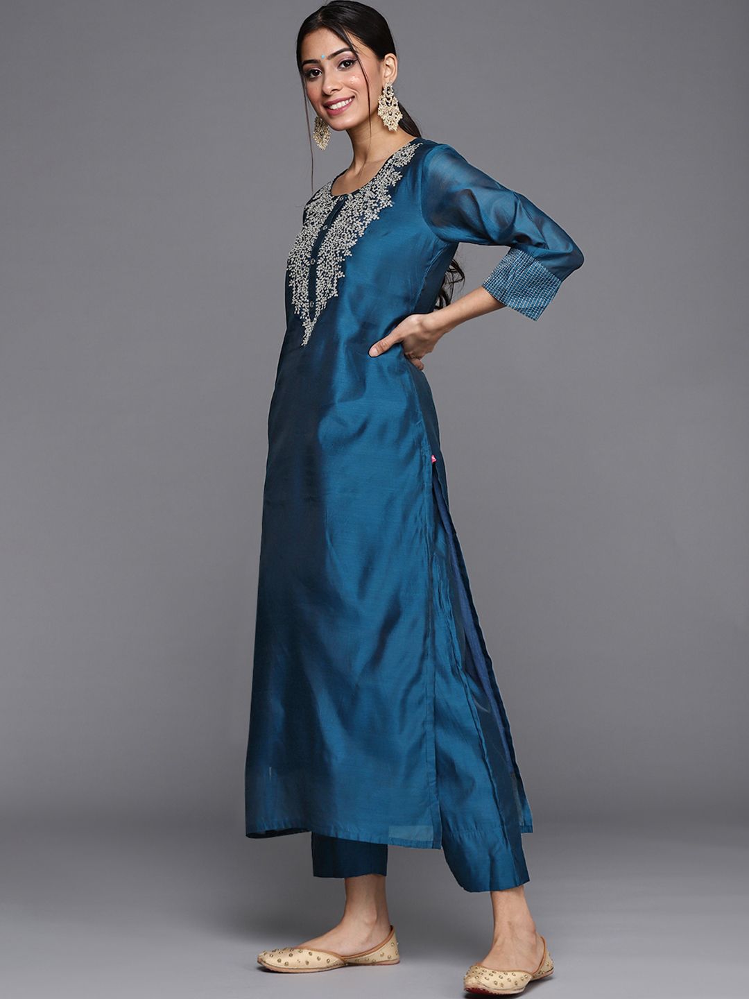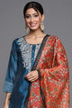 Teal blue, gold and orange yoke design Kurta with Trousers with dupatta
